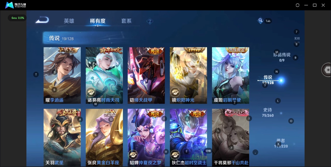 - [11497761]V6 1珍品传说 5传说 124英雄 207皮肤 可修改实名 珍品传说:时之奇旅-孙策 传说皮:幻光神枪,地狱之眼,云鹰飞将(小将军),炽阳神光 珍宝阁皮:妄想食味,蔷薇恋人 限定皮:鸣野蒿,飞衡(韩信年限),遇见飞天,高山流水,五谷丰年,游园惊梦,梁祝,李小龙,猪悟能,大圣娶亲,引擎之心,冰霜恋舞曲 史诗皮:化蝶舞,破空之剑,苍穹之光,电玩小子(小书包),黄金分割率,特工魅影,千年之狐,江河有灵,青蛇,龙骑士(小龙虾),乱世虎臣,修罗,女仆咖啡,水果甜心,天才门将,星夜王子,心灵骇客,功夫厨神,暗隐猎兽者,幽灵船长,鬼剑武藏,心灵战警,舞动绿茵,地狱岩魂,缤纷独角兽,乘风破浪,逐浪之夏,水晶猎龙者,曙光守护者,金属风暴,原初追逐者,圣诞恋歌,鹰眼统帅,黎明之约,无心