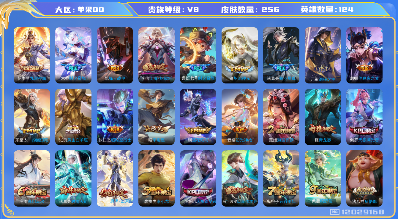 [12029168]V8 1典藏 19传说 124英雄 256皮肤 可修改实名 连体和平 优质装备:九霄神辉(木兰典藏),绛天战甲(鸡嘴战神),黄金白羊座,炽阳神光,仲夏夜之梦(大飞蛾),李逍遥,超时空战士-狄仁杰,山海·炽霜斩(李信年限),鹤羽星尊,灼幽烈阳,鲁班七号-时之奇旅,大乔-时之奇旅,澜逐花归海,诡秘之主,涂山容容 传说皮:幻光神枪 珍宝阁皮:优雅恋人,蔷薇恋人 限定皮:愿照·山河定(司空震年限),鸣野蒿,时雨天司(水龙头),高山流水,五谷丰年,青龙志(铠年限),武圣,游园惊梦,天狼溯光者,天狼绘梦者,李小龙,霸王别姬-虞姬,猪悟能,大圣娶亲,引擎之心,美猴王,山海·玄木吟(马可年限) 史诗皮:龙之律动,石田雨龙,百相守梦-周瑜,破空之剑,芈月浮光幕影,百相守梦-黄忠,紫霞仙子,苍穹之光,电玩小子(小书包),白龙吟,黄金分割率,特工魅影,千年之狐,江河有灵,百解令(蒙犽),匿光破解者,冰冠公主,偶像歌手,电玩·爆裂旋风,末日机甲-吕布,时之恋人-孙尚香,乱世虎臣,节奏热浪,女仆咖啡,摇滚巨星,水果甜心,天才门将,星夜王子,心灵骇客,功夫厨神,暗隐猎兽者,幽灵船长,鬼剑武藏,心灵战警,舞动绿茵,地狱岩魂,纤云弄巧,拒霜思,缤纷独角兽,乘风破浪,逐浪之夏,水晶猎龙者,曙光守护者,金属风暴,圣诞狂欢,鹰眼统帅,暗夜贵公子,未来纪元-赵云