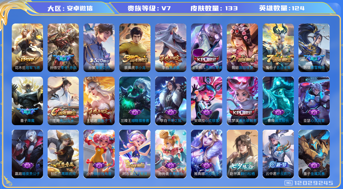 - [12297263]V9 2典藏 1珍品传说 39传说 125英雄 353皮肤 典藏英雄武则天 可修改实名 优质装备:无限飓风号(高达),弑枪猎影(韩信典藏),江户川柯南,黄金狮子座,黄金射手座,冠军飞将,云鹰飞将(小将军),绛天战甲(鸡嘴战神),黄金白羊座,猫影幻舞,久胜战神,炽阳神光,末日机甲-孙尚香(绿蚂蚱),地狱火,零号·赤焰,海洋之心,地狱之眼,飞鸢探春,胖达荣荣,乞巧织情,时之恋人-刘备(电焊工),游龙清影(小青龙),淬星耀世,挚爱之约,无双飞将,记忆之芯(机甲兔),百相守梦(张飞),灼幽烈阳,惊梅引,大乔-时之奇旅,黄金天蝎座 传说皮:祥瑞亨通,幻光神枪 珍宝阁皮:蔷薇恋人,女武神,玩趣恶龙 限定皮:愿照·九州拓(澜年限),愿照·福禄聚(蔡文姬年限),愿照·岁时盈(虞姬年限),愿照·山河定(司空震年限),愿照·众生和(妲己年限),愿照·千秋盛(女娲年限),逐霄战戟,鸣野蒿,至尊宝,遇见飞天,高山流水,五谷丰年,冰锋战神,武圣,天狼运算者,游园惊梦,梁祝,烈魂,天狼溯光者,虎魄,天狼征服者,天狼绘梦者,李小龙,逐梦之影,引擎之心 史诗皮:器灵·浮梦炉,东方月初,百相守梦-百里守约,紫霞仙子,苍穹之光,电玩小子(小书包),白龙吟,黄金分割率,特工魅影,千年之狐,江河有灵,魅语,蒙恬荣光圣徽,冰冠公主,偶像歌手,电玩·爆裂旋风,百相守梦(刘备),暗夜猫娘,龙骑士(小龙虾),末日机甲-吕布,猫狗日记-孙策,猫狗日记-大乔,时之恋人-孙尚香,乱世虎臣,节奏热浪,修罗,女仆咖啡,摇滚巨星,水果甜心,绅士熊喵,天才门将,星夜王子,心灵骇客,功夫厨神,德古拉伯爵,暗隐猎兽者,幽灵船长,鬼剑武藏,心灵战警,乐园奇幻夜,舞动绿茵,地狱岩魂,纤云弄巧,繁星吟游(呼啦呼啦),拒霜思,缤纷独角兽,乘风破浪,逐浪之夏,月团寄思,水晶猎龙者,曙光守护者,箭羽风息,唤灵魅影,金属风暴,圣诞狂欢,圣诞恋歌,鹰眼统帅,魅力维加斯,滕王阁序,千筹问战,无心,未来纪元-赵云