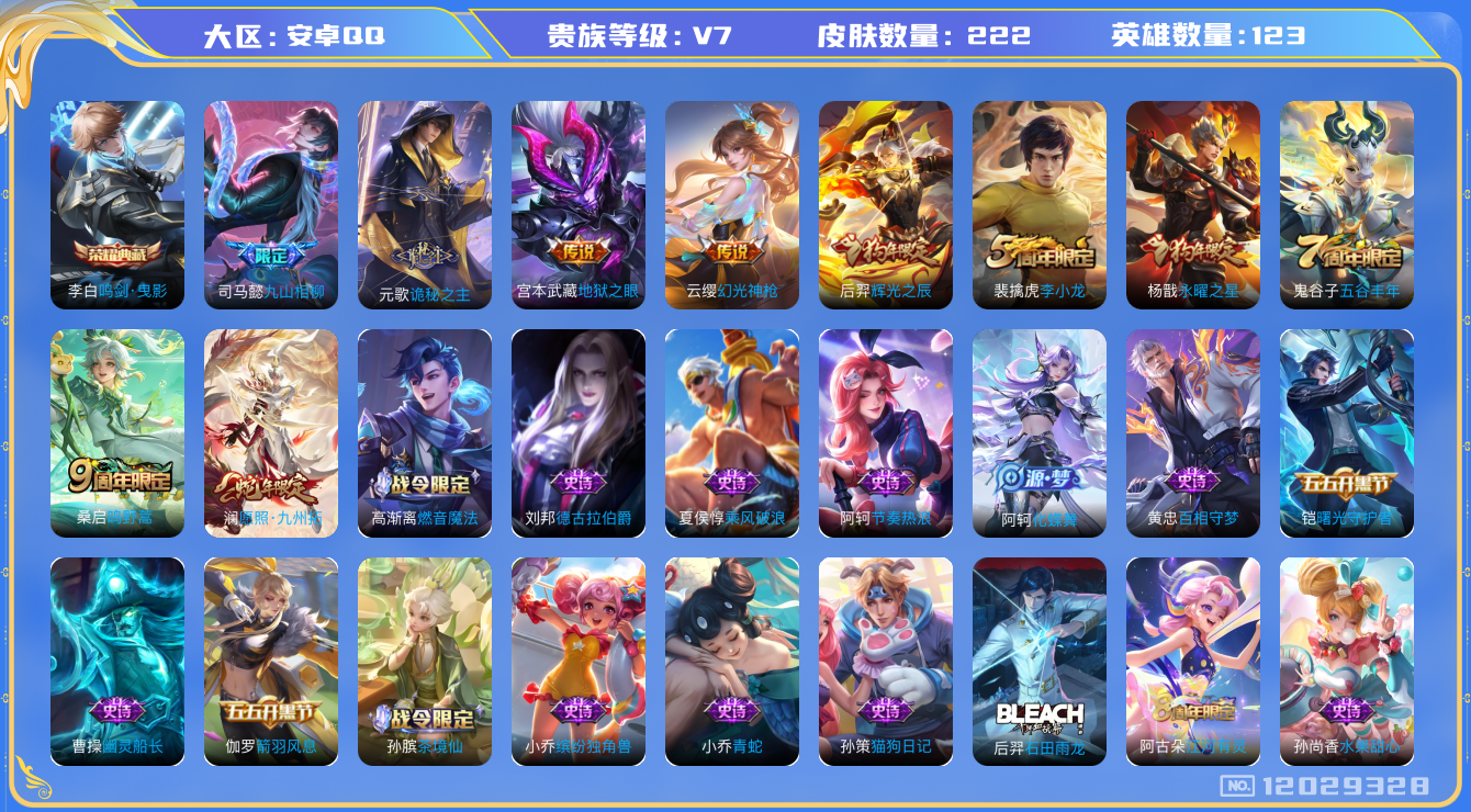 [12029328]V7 1典藏 7传说 123英雄 222皮肤 可修改实名 优质装备:鸣剑·曳影,地狱之眼,诡秘之主,涂山容容 传说皮:九山相柳,幻光神枪 珍宝阁皮:万物之道,蔷薇恋人 限定皮:愿照·九州拓(澜年限),鸣野蒿,五谷丰年,李小龙,永曜之星,辉光之辰 史诗皮:化蝶舞,星界战将,龙之律动,石田雨龙,百相守梦-周瑜,茶境仙,破空之剑,蒙犽顽岩魄,上官婉儿群星魔术团,蔬乡物语(鲁班七号),百相守梦-黄忠,织梦人,守夜人,紫霞仙子,特工魅影,千年之狐,江河有灵,百解令(蒙犽),高渐离燃音魔法,蒙恬荣光圣徽,冰冠公主,青蛇,偶像歌手,电玩·爆裂旋风,末日机甲-吕布,猫狗日记-孙策,节奏热浪,女仆咖啡,水果甜心,天才门将,星夜王子,功夫厨神,德古拉伯爵,暗隐猎兽者,幽灵船长,鬼剑武藏,心灵战警,纤云弄巧,拒霜思,缤纷独角兽,乘风破浪,逐浪之夏,水晶猎龙者,曙光守护者,箭羽风息,金属风暴,原初追逐者,圣诞恋歌,鹰眼统帅,魅力维加斯,无心,未来纪元-赵云