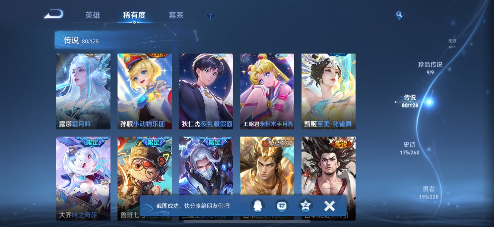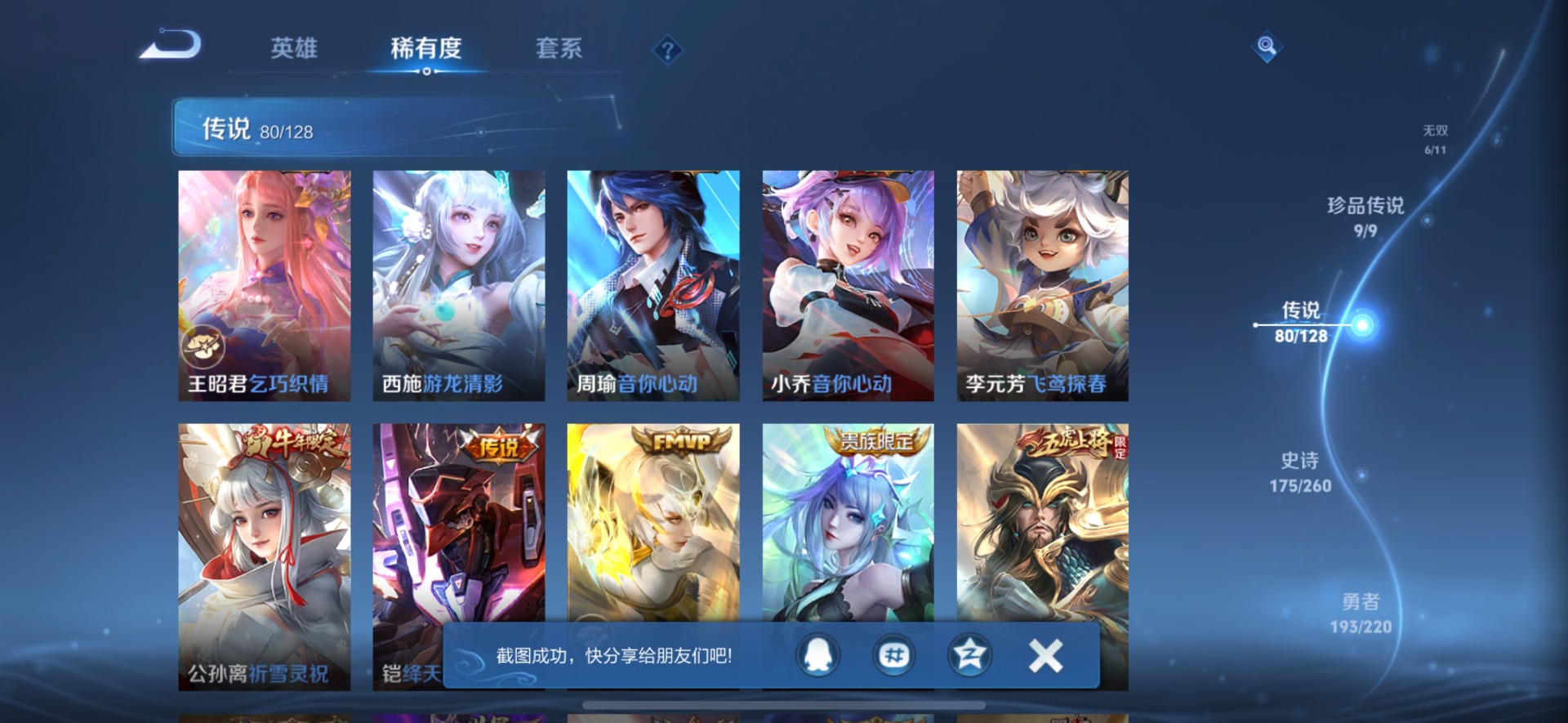 刘备时之恋人,小乔音你心动,李信一念神魔,孙尚香音你闪耀,露娜霜月吟,庄周牧神诗旅,镜炽阳神光,周瑜音你心动,杨玉环星之鸣奏,宫本武藏惊梅引,裴擒虎祥瑞亨通,貂蝉猫影幻舞,嬴政玄雷天君,张良黄金白羊座,曜云鹰飞将,百里守约碎云,澜逐花归海,虞姬云霓雀翎,王昭君永恒水手月亮,大乔时之奇旅,铠绛天战甲,铠琥珀纪元,孙膑小动物乐团,张飞百相守梦,赵云淬星耀世,干将莫邪久胜战神,孙策末日机甲,达摩黄金狮子座,王昭君乞巧织情,鲁班七号时之奇旅,吕布遇见神鼓,后羿千劫归真,公孙离记忆之芯,亚连落雪白狼,夏洛特浮生妄,艾琳觅芳踪,西施游龙清影,西施续相思,狄仁杰夜礼服假面,马超无双飞将,李元芳飞鸢探春,云缨幻光神枪