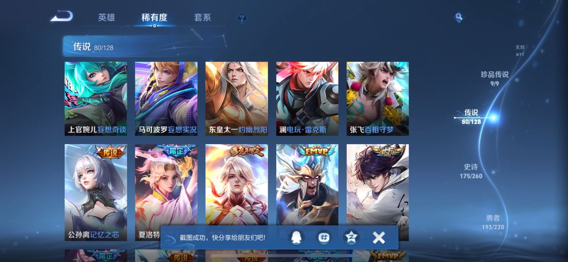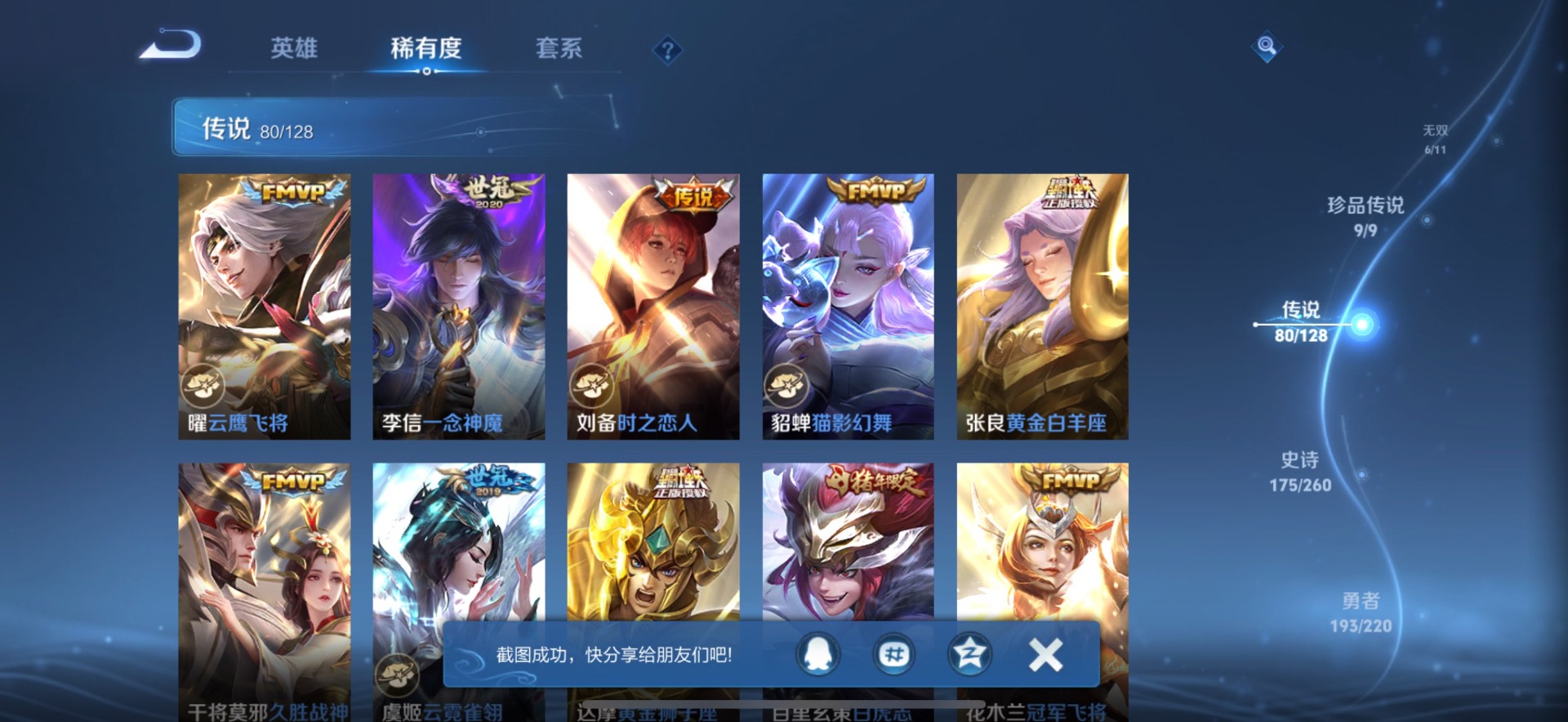 夏侯惇无限飓风号,小乔天鹅之梦,孙尚香杀手不太冷,花木兰九霄神辉,孙悟空全息碎影,韩信弑枪猎影,虞姬神鉴启示录,貂蝉幻阙歌,伽罗最初的交响,瑶拾光映像