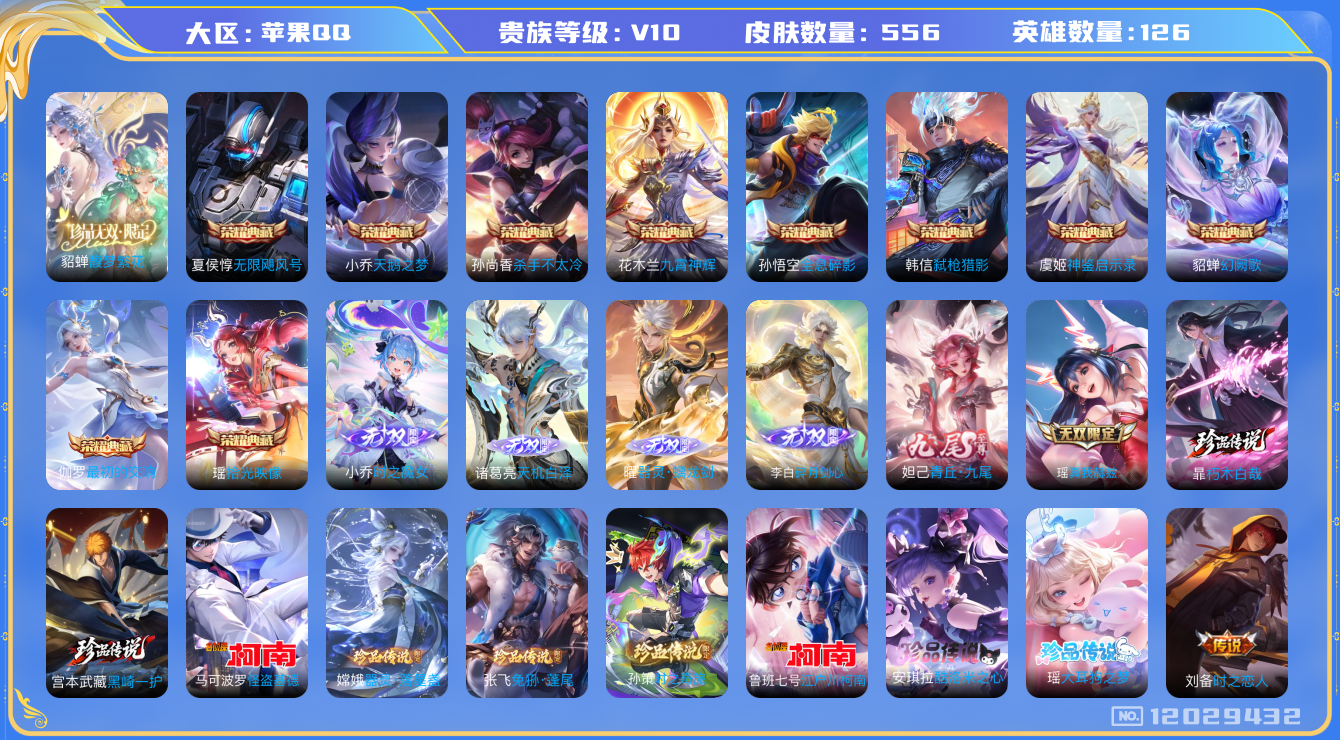 [12029432]V10 10典藏 1珍品无双 6无双 9珍品传说 80传说 126英雄 556皮肤 典藏英雄武则天 可修改实名 武则天小国标 优质装备:馥梦繁花,天鹅之梦(小乔典藏),无限飓风号(高达),杀手不太冷,全息碎影(猴子典藏),九霄神辉(木兰典藏),幻阙歌(貂蝉典藏),弑枪猎影(韩信典藏),真我赫兹(瑶)(瑶无双),青丘·九尾(妲己无双),碎月剑心(李白无双),神鉴启示录,小乔时之魔女(小乔无双),拾光映像(瑶典藏),器灵·螭龙剑,最初的交响(伽罗典藏),天机白泽,江户川柯南,怪盗基德,器灵·落星盏,酷洛米之心,大耳狗之梦,朽木白哉,黑崎一护,黄金狮子座,黄金射手座,冠军飞将,云鹰飞将(小将军),绛天战甲(鸡嘴战神),黄金白羊座,猫影幻舞,久胜战神,炽阳神光,一念神魔,云霓雀翎,末日机甲-孙尚香(绿蚂蚱),地狱火,仲夏夜之梦(大飞蛾),音你心动-小乔,海洋之心,地狱之眼,飞鸢探春,音你心动-周瑜,乞巧织情,时之恋人-刘备(电焊工),游龙清影(小青龙),淬星耀世,超时空战士-狄仁杰,末日机甲-孙策,无双飞将,音你闪耀(rap皮),碎云,天秀幻梦,山海·炽霜斩(李信年限),浮生妄,记忆之芯(机甲兔),青丘·九尾,百相守梦(张飞),电玩·雷克斯,灼幽烈阳,妄想实况,妄想奇谈,惊梅引,遇见神鼓,鲁班七号-时之奇旅,大乔-时之奇旅,永恒水手月亮,夜礼服假面,小动物乐团,霜月吟,澜逐花归海,艾琳觅芳踪,琥珀纪元铠,牧神诗旅,玄雷天君,千劫归真,诡秘之主,涂山容容 珍品传说:时之奇旅-孙策,兔狲·蓬尾 传说皮:落雪白狼,死亡执政官,九山相柳,云诺千山,续相思,星之鸣奏,祥瑞亨通,幻光神枪 珍宝阁皮:优雅恋人,蔷薇恋人 限定皮:愿照·九州拓(澜年限),愿照·山河定(司空震年限),愿照·千秋盛(女娲年限),逐霄战戟,映山客,陌上桑,鸣野蒿,至尊宝,白虎志(电光耗子),武陵仙君(小桃花),异界灵契(白毛香),绯月行,白晶晶,山海·碧波行(瑶年限),瑞麟志(木兰年限),至美·乘鲤谣,至美·化雀舞,影龙天霄,遇见飞天,高山流水,诗剑行,怒海麟威,五谷丰年,冰锋战神,武圣,游园惊梦,梁祝,逐梦之星,烈魂,岱宗(典韦年限),逐梦之音,奔雷神使(牛魔年限),祈雪灵祝(雪兔子),李小龙,逐梦之影,永曜之星,霸王别姬-虞姬,纯白花嫁,一生所爱,大圣娶亲,引擎之心,天魔缭乱,青春决赛季,冰霜恋舞曲