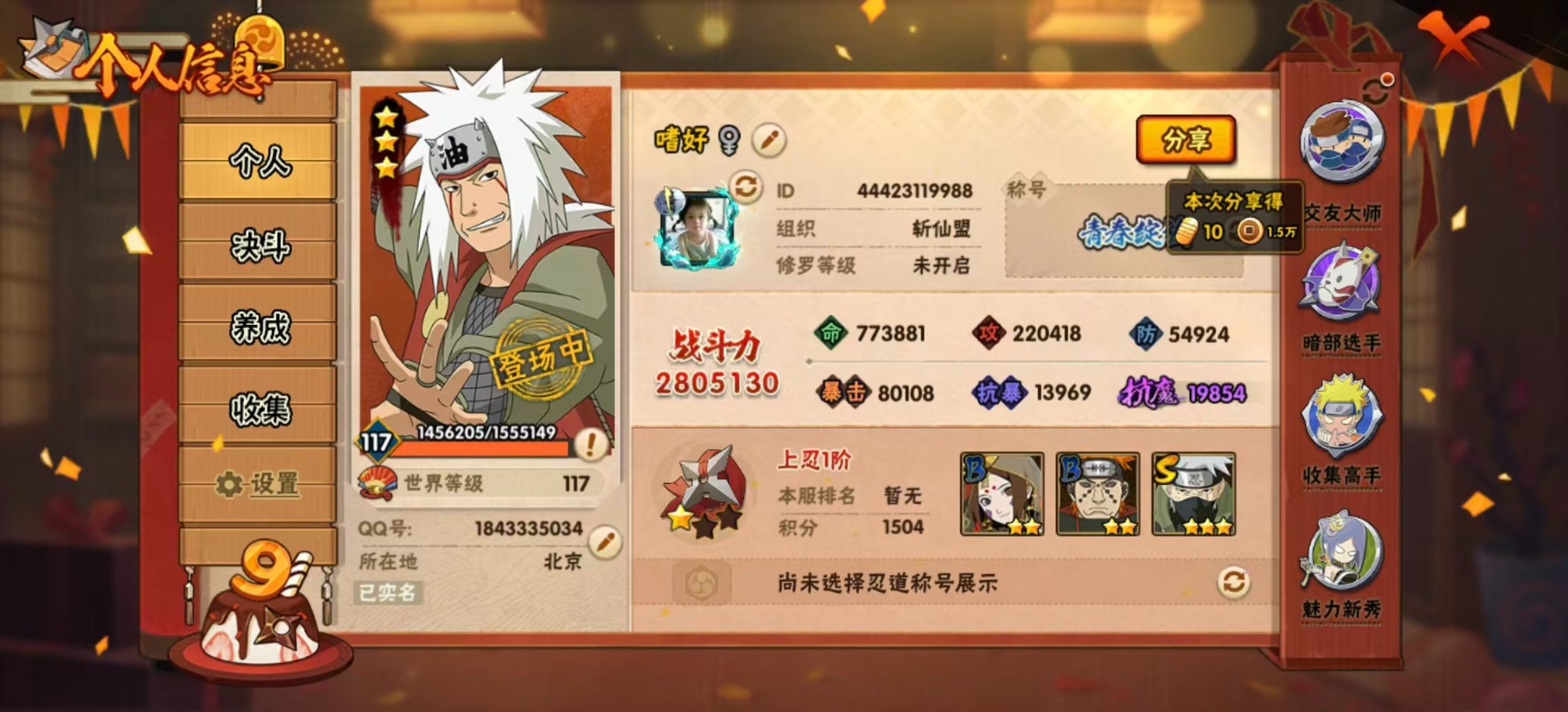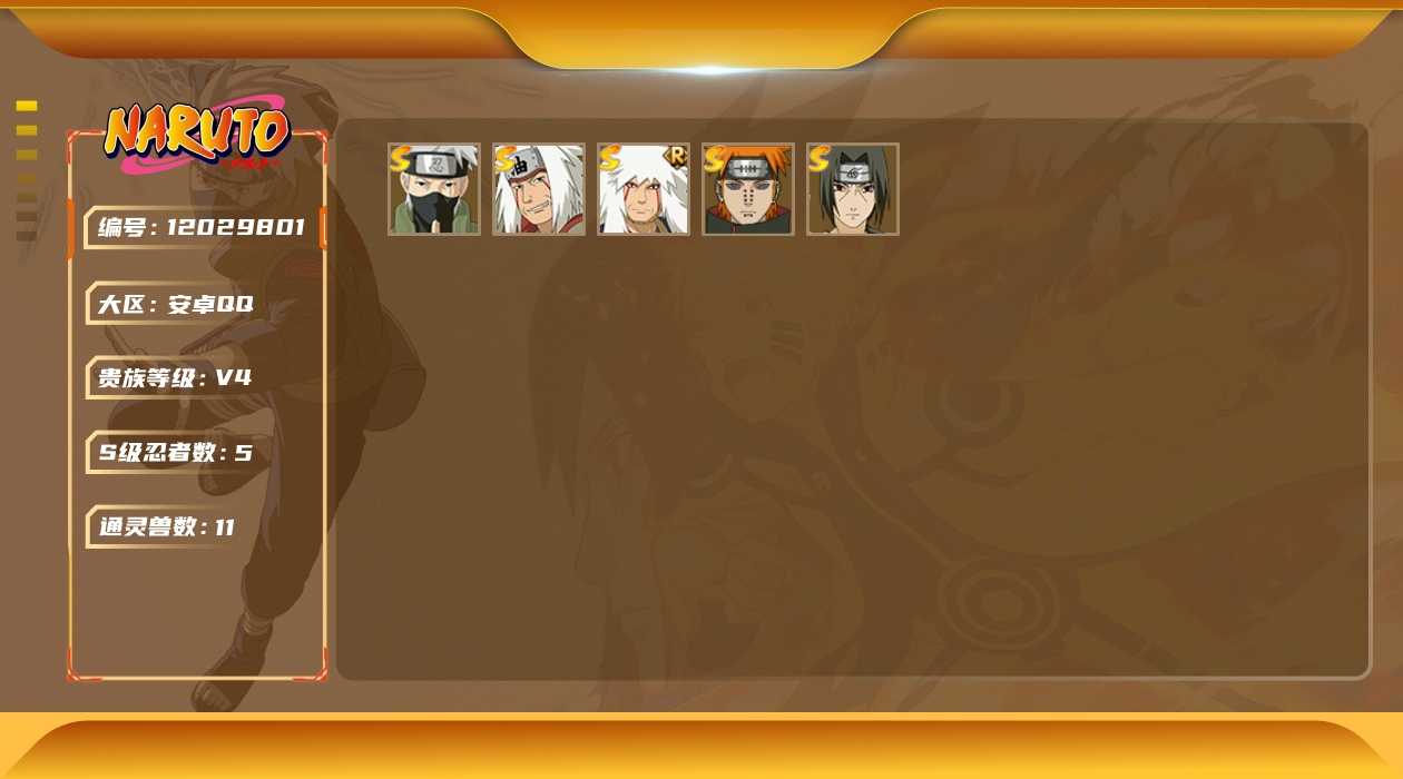 [12029801]V4 5S忍 14A忍 11通灵 280.5W战力 可二次 可修改实名 优质装备:旗木卡卡西「须佐能乎」,自来也 「传说中的三忍」 S级忍者:自来也 「舞之豪杰」,宇智波鼬 「须佐能乎」,佩恩「天道」