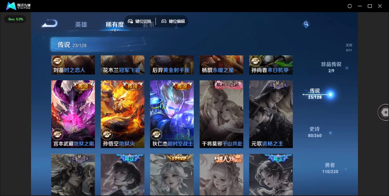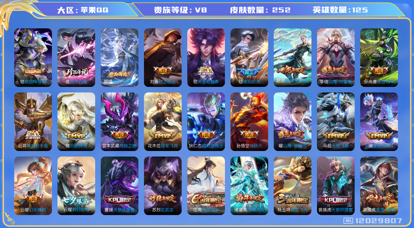 [12029807]V8 1典藏 2珍品传说 23传说 125英雄 252皮肤 可修改实名 优质装备:银白咏叹调(倪克斯侍卫),器灵·落星盏,朽木白哉,黄金射手座,冠军飞将,炽阳神光,末日机甲-孙尚香(绿蚂蚱),地狱火,地狱之眼,时之恋人-刘备(电焊工),超时空战士-狄仁杰,无双飞将,山海·炽霜斩(李信年限),山海·苍雷引(电光曜子),鹤归松栖(云缨),澜逐花归海,琥珀纪元铠,涂山容容 传说皮:乘龙·铭钟鼎(赵云年限),铠冥王哈迪斯,幻光神枪 珍宝阁皮:万物之道,玩趣恶龙 限定皮:鸣野蒿,傲雪梅枪,时雨天司(水龙头),神威(电光马子),遇见飞天,高山流水,诗剑行,五谷丰年,天狼狩猎者,逐梦之星,天狼征服者,玄武志(苏烈年限),永曜之星,孙行者,猪悟能,寅虎·赤拳(老虎年限) 史诗皮:赞萌露比,器灵·浮梦炉,星界战将,龙之律动,石田雨龙,茶境仙,破空之剑,东方月初,埋骨钱,芈月浮光幕影,百相守梦-百里守约,百相守梦-黄忠,紫霞仙子,苍穹之光,白龙吟,黄金分割率,特工魅影,千年之狐,江河有灵,鹤归松栖(赵怀真),魅语,蒙恬荣光圣徽,晚萤,电玩·爆裂旋风,银翎春语,龙骑士(小龙虾),末日机甲-吕布,猫狗日记-孙策,乱世虎臣,节奏热浪,修罗,摇滚巨星,水果甜心,星夜王子,心灵骇客,功夫厨神,德古拉伯爵,暗隐猎兽者,幽灵船长,鬼剑武藏,暗渊魔法,缤纷独角兽,乘风破浪,逐浪之夏,水晶猎龙者,曙光守护者,热力回旋,金属风暴,原初追逐者,圣诞狂欢,圣诞恋歌,鹰眼统帅,魅力维加斯,黎明之约,赏金猎手,顽趣-阿古朵,无心,未来纪元-赵云