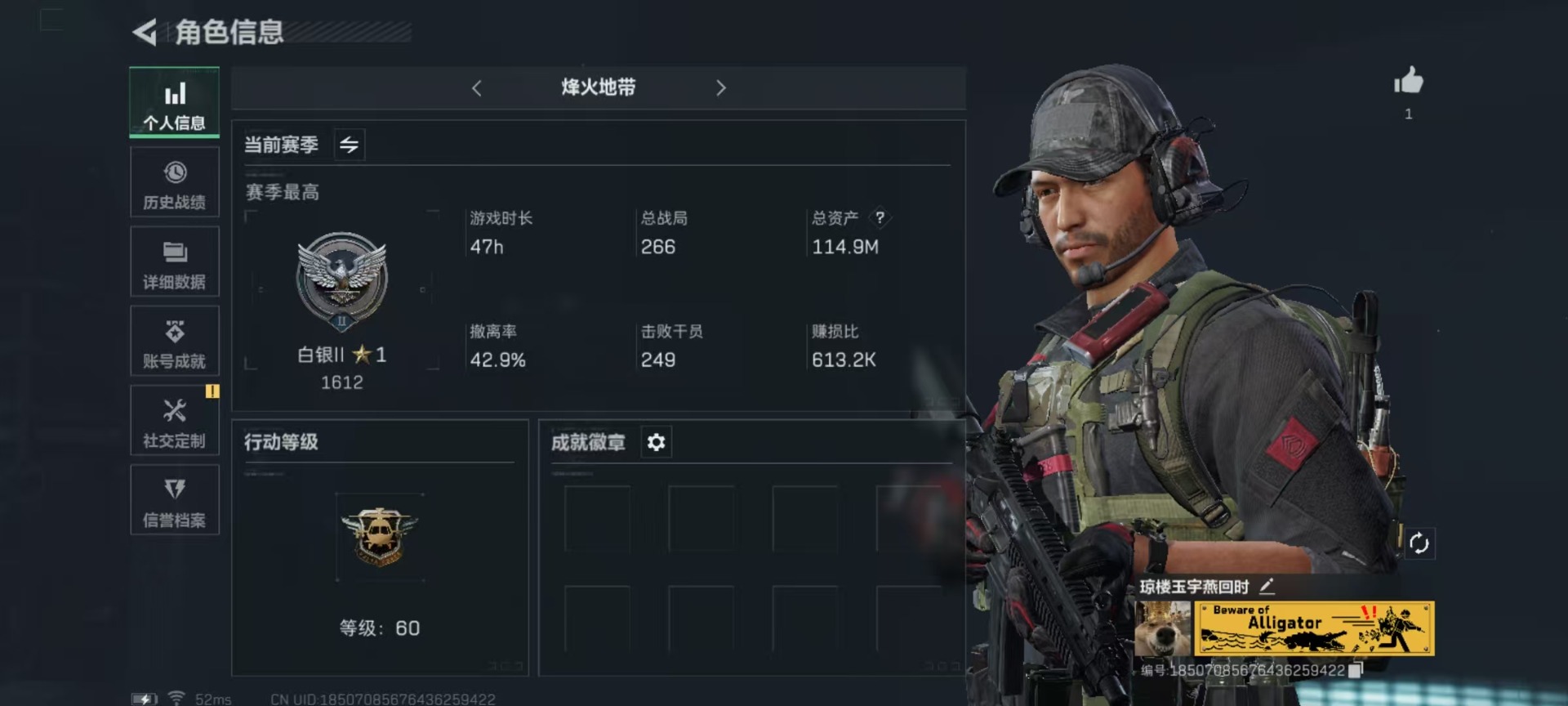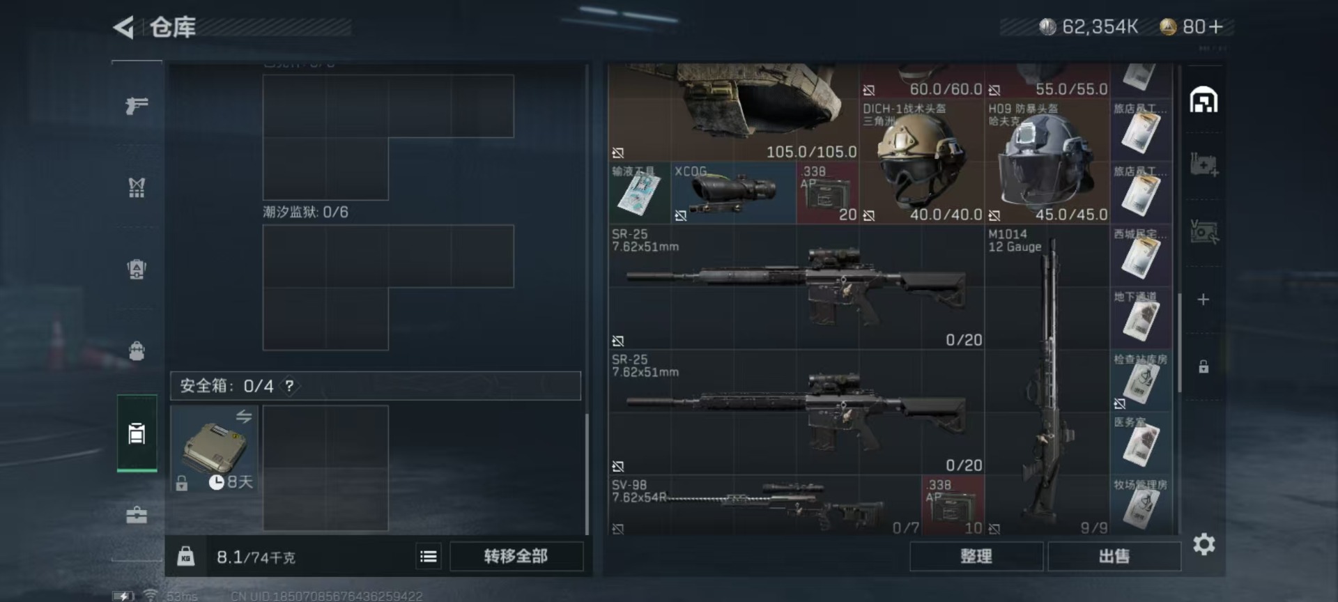 [12029968]总资产:114.9M 6传说枪械 哈夫币:62.354K 进阶安全箱(2×2)9.15号到期 可二次 可修改实名 烽火地带段位:白银 全面战场段位:无段位 传说武器皮肤:AWM狙击步枪-捞点薯条,腾龙突击步枪-捞点薯条,93R-捞点薯条,勇士冲锋枪-能天使-午夜邮差,Vector冲锋枪-能天使-午夜邮差,M4A1突击步枪-阿米娅 史诗武器皮肤:QJB201轻机枪-Old Habits,M250通用机枪-囚徒,SV-98狙击步枪-林中猎手