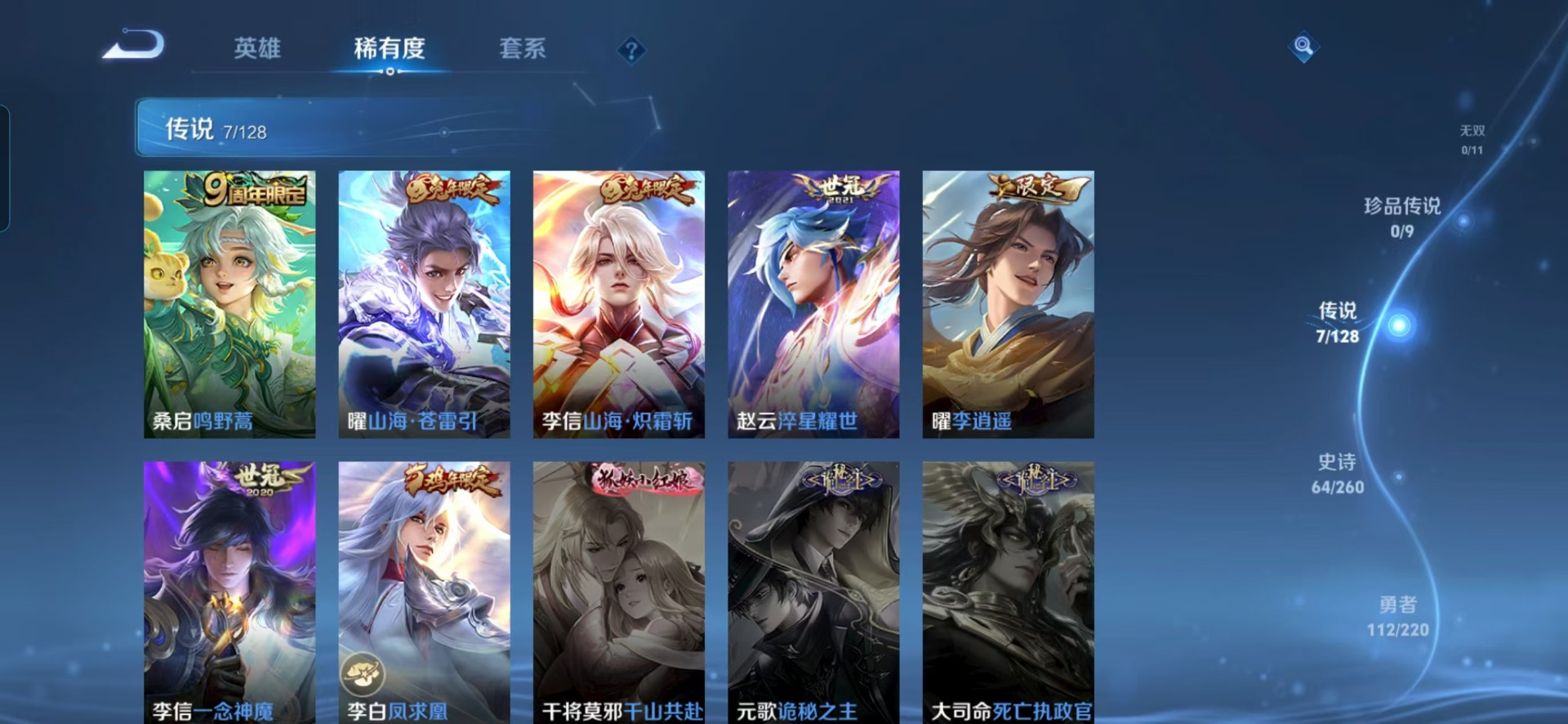 - PX_2101535-/皮肤190/典藏2/传说19/史诗49/英雄123/天鹅之梦/伽罗最初的交响/金色仲夏夜/真我赫兹瑶/嫦娥器灵落星盏/张飞兔狲蓬尾/瑶大耳狗之梦/安琪拉酷洛米之心/女武神/特工战影/地狱之眼/仲夏夜之梦/黄金射手座/黄金狮子座/云霓雀翎/久胜战神/猫影幻舞/一念神魔/启明星使/炽阳神光/飞鸢探春/音你心动男/游龙清影/淬星耀世/至美化雀舞/虞姬愿照岁时盈/妲己愿照众生和/女