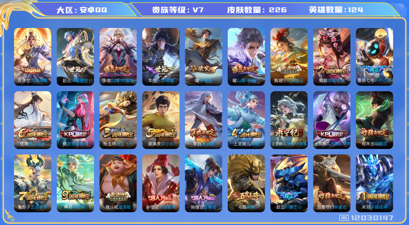 [12030147]V7 1典藏 7传说 124英雄 226皮肤 可修改实名 优质装备:九霄神辉(木兰典藏),一念神魔,李逍遥,淬星耀世,山海·炽霜斩(李信年限),山海·苍雷引(电光曜子),涂山容容 珍宝阁皮:胡桃夹子,优雅恋人,女武神,玩趣恶龙 限定皮:鸣野蒿,至尊宝,凤求凰(白切鸡),神威(电光马子),瑞麟志(木兰年限),遇见飞天,高山流水,五谷丰年,冰锋战神,游园惊梦,梁祝,天狼绘梦者,李小龙,朱雀志(守约年限),猪悟能,大圣娶亲,引擎之心,乒乒小将,匿光追影者,女儿国国王,神器·万象笔 史诗皮:紫霞仙子,电玩小子(小书包),黄金分割率,千年之狐,蒙恬荣光圣徽,冰冠公主,晚萤,电玩·爆裂旋风,暗夜猫娘,龙骑士(小龙虾),猫狗日记-孙策,猫狗日记-大乔,节奏热浪,修罗,女仆咖啡,摇滚巨星,水果甜心,天才门将,功夫厨神,暗隐猎兽者,幽灵船长,鬼剑武藏,暗渊魔法,纤云弄巧,水晶猎龙者,金属风暴,原初追逐者,圣诞狂欢,圣诞恋歌,鹰眼统帅,黎明之约,赏金猎手,无心,未来纪元-赵云