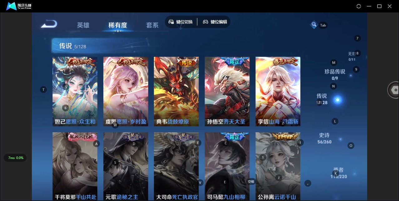 - [11846836]V7 1典藏 11传说 123英雄 188皮肤 可修改实名 优质装备:鸣剑·曳影,云鹰飞将(小将军),炽阳神光,一念神魔,无双飞将,碎云,山海·炽霜斩(李信年限),记忆之芯(机甲兔),澜逐花归海,涂山容容 传说皮:幻光神枪 珍宝阁皮:胡桃夹子,玩趣恶龙 限定皮:愿照·山河定(司空震年限),逐霄战戟,鸣野蒿,五谷丰年,李小龙,朱雀志(守约年限),时之祈愿-云中君,山海·玄木吟(马可年限) 史诗皮:星界战将,龙之律动,茶境仙,百相守梦-黄忠,黄金分割率,特工魅影,江河有灵,鹤归松栖(赵怀真),魅语,蒙恬荣光圣徽,电玩·爆裂旋风,暗夜猫娘,龙骑士(小龙虾),末日机甲-吕布,乱世虎臣,修罗,摇滚巨星,水果甜心,绅士熊喵,天才门将,星夜王子,德古拉伯爵,暗隐猎兽者,幽灵船长,鬼剑武藏,舞动绿茵,地狱岩魂,缤纷独角兽,乘风破浪,逐浪之夏,水晶猎龙者,曙光守护者,金属风暴,原初追逐者,圣诞狂欢,圣诞恋歌,鹰眼统帅,魅力维加斯,无心,未来纪元-赵云