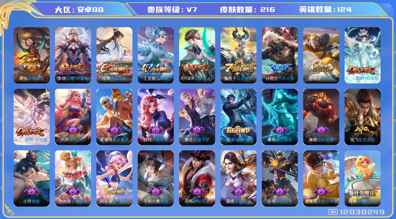 [12030249]V7 5传说 124英雄 216皮肤 可修改实名 女号 优质装备:山海·炽霜斩(李信年限),涂山容容 传说皮:典韦战鼓燎原 珍宝阁皮:蔷薇恋人,玩趣恶龙 限定皮:愿照·岁时盈(虞姬年限),愿照·众生和(妲己年限),高山流水,齐天大圣,五谷丰年,梁祝,孙行者,山海·玄木吟(马可年限) 史诗皮:鸭鸭历险记-刘禅,瑰影绮梦,龙之律动,超元猎域,百相守梦-黄忠,织梦人,紫霞仙子,黄金分割率,特工魅影,千年之狐,江河有灵,魅语,无限星赏官,青蛇,偶像歌手,电玩·爆裂旋风,末日机甲-吕布,猫狗日记-大乔,乱世虎臣,节奏热浪,修罗,女仆咖啡,水果甜心,绅士熊喵,星夜王子,功夫厨神,暗隐猎兽者,幽灵船长,鬼剑武藏,暗渊魔法,心灵战警,天秀·启明,地狱岩魂,拒霜思,乘风破浪,逐浪之夏,水晶猎龙者,曙光守护者,金属风暴,原初追逐者,圣诞狂欢,圣诞恋歌,鹰眼统帅,魅力维加斯