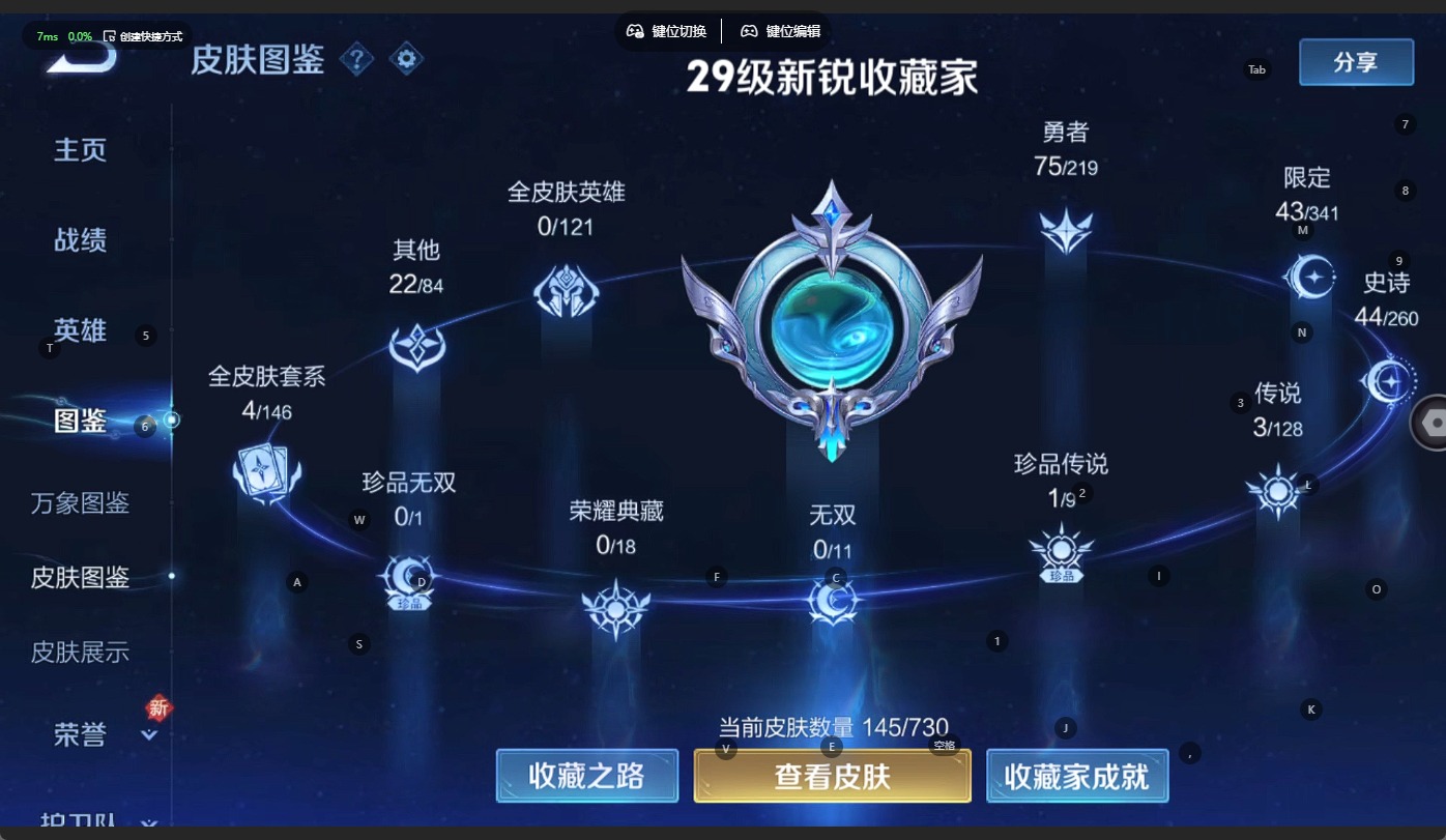 - PX_2082819-贵族等级: V6 英雄数: 119 皮肤数: 79 荣耀水晶: 杀手不太冷 传说皮: 地狱火,超时空战士-狄仁杰 限定皮: 五谷丰年