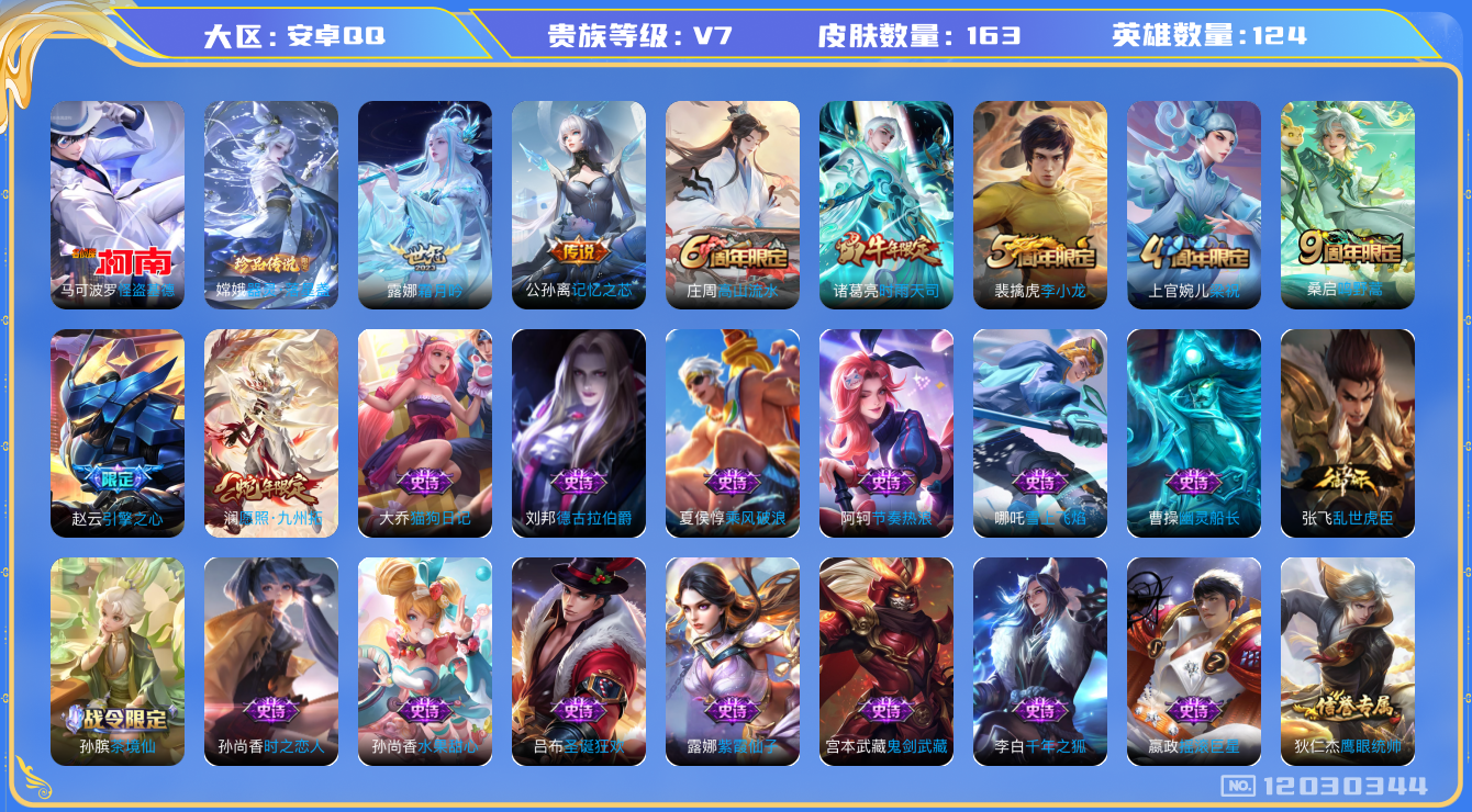[12030344]V7 2珍品传说 5传说 124英雄 163皮肤 可修改实名 优质装备:怪盗基德,器灵·落星盏,记忆之芯(机甲兔),霜月吟 珍宝阁皮:蔷薇恋人,玩趣恶龙 限定皮:愿照·九州拓(澜年限),鸣野蒿,时雨天司(水龙头),高山流水,梁祝,李小龙,引擎之心 史诗皮:茶境仙,百相守梦-百里守约,紫霞仙子,千年之狐,猫狗日记-大乔,时之恋人-孙尚香,乱世虎臣,节奏热浪,修罗,女仆咖啡,摇滚巨星,水果甜心,德古拉伯爵,幽灵船长,鬼剑武藏,舞动绿茵,拒霜思,乘风破浪,逐浪之夏,热力回旋,金属风暴,圣诞狂欢,鹰眼统帅,魅力维加斯,雪上飞焰,未来纪元-赵云