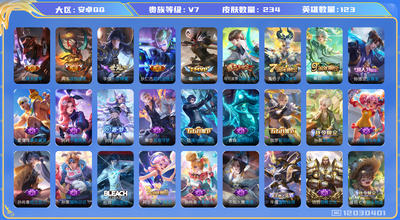 [12030401]V7 6传说 123英雄 234皮肤 可修改实名 优质装备:云鹰飞将(小将军),绛天战甲(鸡嘴战神),一念神魔,超时空战士-狄仁杰,涂山容容 传说皮:典韦战鼓燎原 珍宝阁皮:胡桃夹子,玩趣恶龙 限定皮:鸣野蒿,至尊宝,五谷丰年,山海·玄木吟(马可年限) 史诗皮:鸭鸭历险记-刘禅,化蝶舞,星界战将,龙之律动,石田雨龙,百相守梦-周瑜,茶境仙,蒙犽顽岩魄,蔬乡物语(鲁班七号),百相守梦-百里守约,百相守梦-黄忠,织梦人,苍穹之光,黄金分割率,特工魅影,江河有灵,魅语,百解令(蒙犽),偶像歌手,末日机甲-吕布,猫狗日记-孙策,时之恋人-孙尚香,节奏热浪,修罗,女仆咖啡,摇滚巨星,水果甜心,绅士熊喵,星夜王子,心灵骇客,功夫厨神,暗隐猎兽者,幽灵船长,鬼剑武藏,心灵战警,乐园奇幻夜,天秀·启明,缤纷独角兽,乘风破浪,逐浪之夏,曙光守护者,箭羽风息,唤灵魅影,金属风暴,圣诞狂欢,魅力维加斯,赏金猎手,未来纪元-赵云