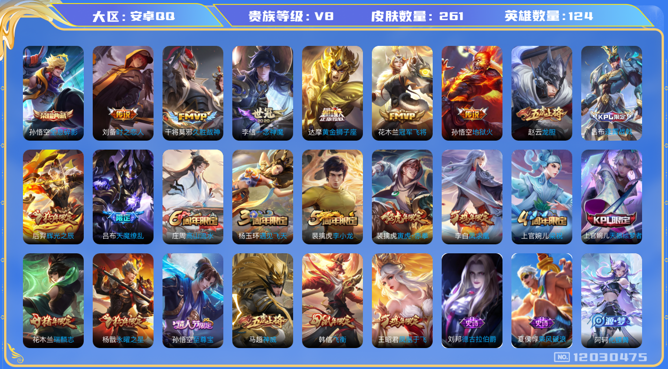 [12030475]V8 1典藏 11传说 124英雄 261皮肤 可修改实名 优质装备:全息碎影(猴子典藏),黄金狮子座,冠军飞将,久胜战神,一念神魔,地狱火,时之恋人-刘备(电焊工) 珍宝阁皮:玩趣恶龙 限定皮:逐霄战戟,至尊宝,凤求凰(白切鸡),凤凰于飞,神威(电光马子),飞衡(韩信年限),瑞麟志(木兰年限),遇见飞天,高山流水,梁祝,龙胆,天狼绘梦者,李小龙,永曜之星,辉光之辰,天魔缭乱,寅虎·赤拳(老虎年限) 史诗皮:化蝶舞,紫霞仙子,苍穹之光,电玩小子(小书包),白龙吟,黄金分割率,特工魅影,千年之狐,江河有灵,百解令(蒙犽),蒙恬荣光圣徽,无限星赏官,冰冠公主,晚萤,猫狗日记-孙策,乱世虎臣,修罗,女仆咖啡,摇滚巨星,水果甜心,天才门将,星夜王子,心灵骇客,功夫厨神,德古拉伯爵,暗隐猎兽者,幽灵船长,鬼剑武藏,地狱岩魂,纤云弄巧,繁星吟游(呼啦呼啦),缤纷独角兽,乘风破浪,逐浪之夏,水晶猎龙者,金属风暴,原初追逐者,圣诞狂欢,圣诞恋歌,鹰眼统帅,王者之锤,魅力维加斯,黎明之约