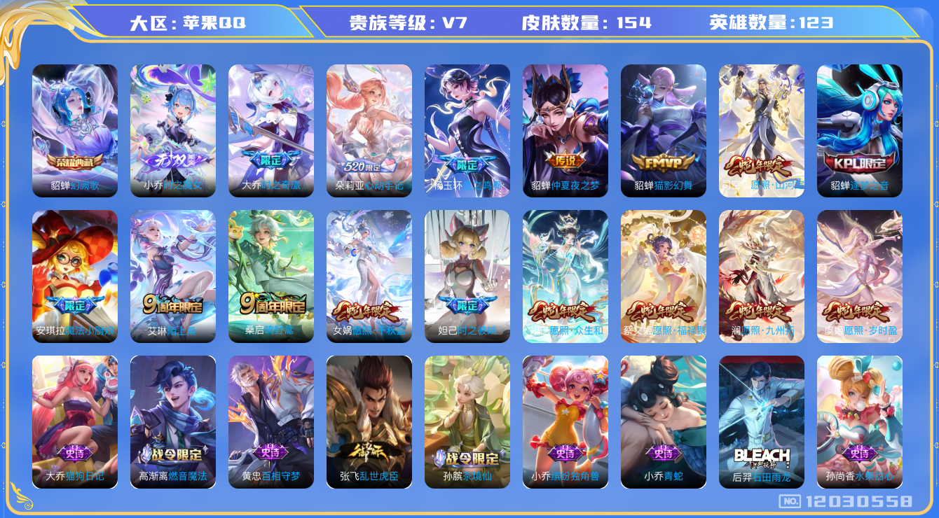 [12030558]V7 1典藏 1无双 12传说 123英雄 154皮肤 可修改实名 优质装备:幻阙歌(貂蝉典藏),小乔时之魔女(小乔无双),猫影幻舞,仲夏夜之梦(大飞蛾),大乔-时之奇旅,朵莉亚心动手记,涂山容容 传说皮:星之鸣奏 珍宝阁皮:蔷薇恋人 限定皮:愿照·九州拓(澜年限),愿照·福禄聚(蔡文姬年限),愿照·岁时盈(虞姬年限),愿照·山河定(司空震年限),愿照·众生和(妲己年限),愿照·千秋盛(女娲年限),陌上桑,鸣野蒿,时之彼端,魔法小厨娘,逐梦之音 史诗皮:鸭鸭历险记-刘禅,器灵·浮梦炉,星界战将,龙之律动,石田雨龙,茶境仙,破空之剑,战舞者,涂山红红,蒙犽顽岩魄,蔬乡物语(鲁班七号),百相守梦-黄忠,遇见神鹿,紫霞仙子,高渐离燃音魔法,无限星赏官,冰冠公主,青蛇,猫狗日记-大乔,乱世虎臣,女仆咖啡,摇滚巨星,水果甜心,星夜王子,心灵骇客,暗隐猎兽者,鬼剑武藏,舞动绿茵,缤纷独角兽,逐浪之夏,唤灵魅影,圣诞恋歌,鹰眼统帅,暗夜贵公子