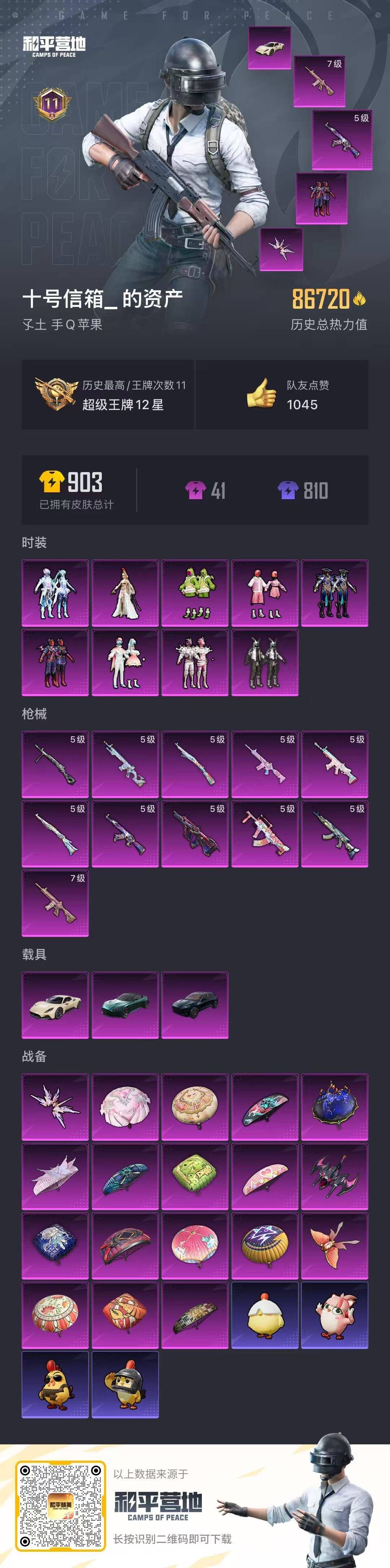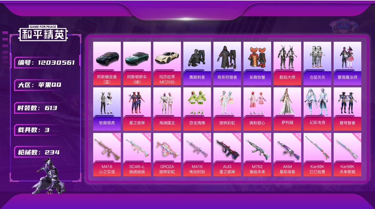 [12030561]9粉装 11特效枪 3载具 11印记 可二次 可修改实名 优质装备:阿斯顿·马丁DBS(绿),阿斯顿·马丁DBX(蓝),玛莎拉蒂MC20(星石白),M416心之恋语,奇异狩猎者,数码大师,M762激战未来,星之彼岸,AUG星之彼岸,GROZA旋转彩虹,AKM星际浪客,Kar98K未来歌姬,SCAR-L-锦绣绵绵,七级M416-心之恋语,M416电玩时刻,萨利娅,MK12-雪月幻音,幻彩电音,Kar98K-巳巳如意 热门装扮:海渊国主,恐龙拽拽,旋转彩虹,碧穹智者,飒粉甜心,软萌银虎,蔷薇魔法师,仓鼠灰灰,鹰眼刺客,呆萌铁蟹 稀有枪皮:DP-28-豹影疾电 五级特效枪:五级M762-激战未来,五级Kar98K-巳巳如意,五级DP-28-豹影疾电,五级MK12-雪月幻音,五级AUG-星之彼岸,五级Kar98K-未来歌姬,五级M416-电玩时刻,五级SCAR-L-锦绣绵绵,五级AKM-星际浪客,五级GROZA-旋转彩虹 紫色装扮:SS23特训,SS31特训套装,云朵鹅,雪绒豹,SS33特训套装,旭日情侣,SS21特训,田园牧歌,轻风白浪,和煦暖阳,SS22特训,顶瓜瓜,圣诞大吉,凛冬战士,北国孤狼,千禧之恋,吉莉礼服,夏日音浪,幻世战舞者,萌趣咩咩,乐音,,SS5特训,六六大吉,军械专家,冰原使者,娇憨猪猪,暴风机械师,SS16特训,天籁歌者,瑞龙福将,团圆交子,SS17特训,治愈之星,迅捷之星,科技之星,SS14特训,萌趣颜团子,特种颜团子,星梦畅游,快乐星愿,青春冒险家,潮流游乐家,SS15特训,暗夜傀儡,SS20特训,梦幻奶油,酸甜橘柚,怒火燎原,SS18特训,豚鼠丹丹,雪兔飞飞,SS19特训,风暴特警,飞行日记,骑行爱好者,鹤鸣,麻辣教官,黎明保卫者,黑色伏地魔,龟仙人,霓虹街区,酷潮明星,跃动心情,酷萌兔限定,金鼠迎春,长空猛禽,雪山征服者,雪山精英,涂山之恋,灰色格斗者,牛气冲天,牛气满满,海岛探路者,探宝勇士,极地朋克,柠萌假日,格斗先锋,缤纷果语,荧惑魅影,蓝彩潮人,竞技勇士朋克,空投萌叽,特战装甲,特殊使命,特训学院,王牌教练,甜蜜告白,甜蜜熊情侣,疯狂小兔子,破晓战魂,福星高照,SS29特训,SS28特训,鱼渊荷华,玉兔迎春,燕燕于飞,巳巳如意,智谋强哥,异域银装,竞技名士,光矢逐梦,神气柴柴,懵萌河马,SS24特训(SS24特训套装),绚紫流光,