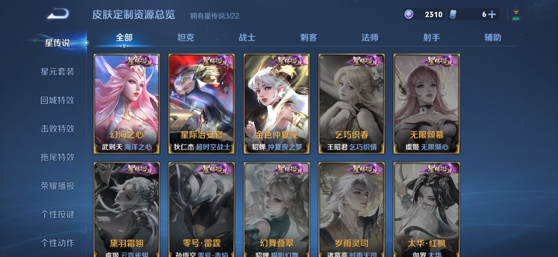刘邦德古拉伯爵,阿轲暗夜猫娘,铠曙光守护者,曹操幽灵船长,伽罗箭羽风息,孙策猫狗日记,不知火舞魅语,吕布圣诞狂欢,吕布末日机甲,司马懿暗渊魔法,刘禅天才门将,宫本武藏鬼剑武藏,兰陵王暗隐猎兽者,花木兰水晶猎龙者,蒙犽百解令,亚瑟心灵战警,程咬金功夫厨神,百里玄策原初追逐者,雅典娜冰冠公主,雅典娜黎明之约,李元芳逐浪之夏,墨子金属风暴,王昭君偶像歌手,嫦娥拒霜思,橘右京修罗