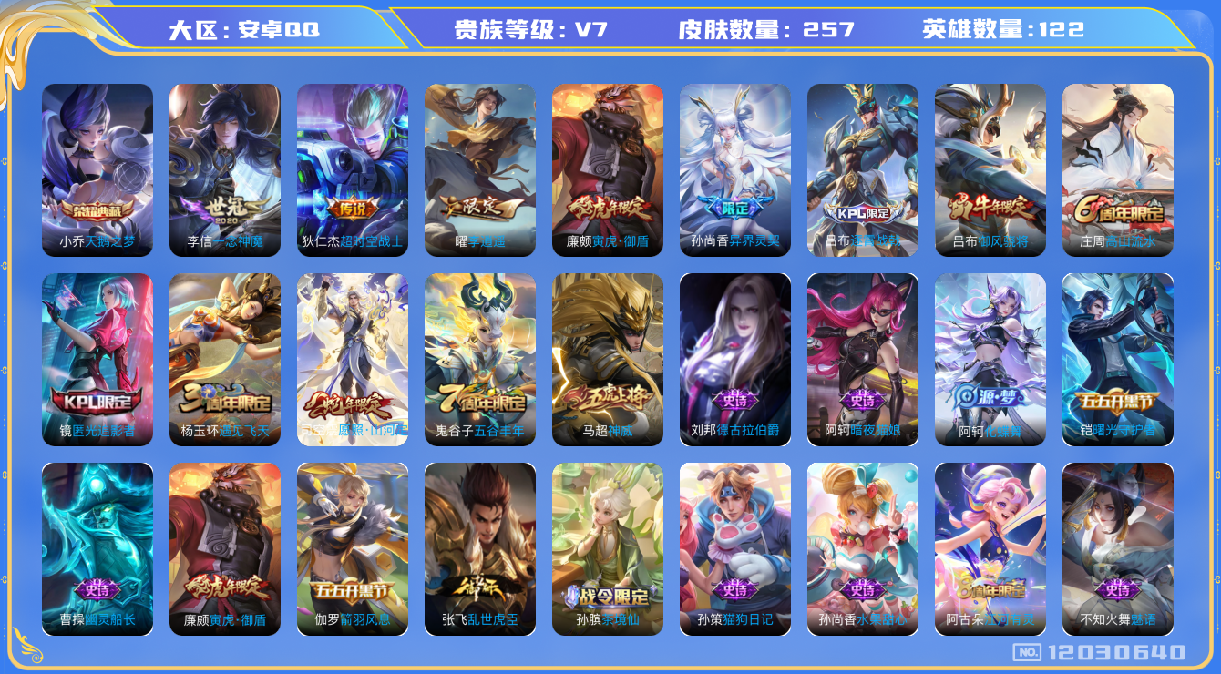 [12030640]V7 1典藏 5传说 122英雄 257皮肤 可修改实名 优质装备:天鹅之梦(小乔典藏),一念神魔,李逍遥,超时空战士-狄仁杰 珍宝阁皮:蔷薇恋人,玩趣恶龙 限定皮:愿照·山河定(司空震年限),逐霄战戟,异界灵契(白毛香),神威(电光马子),遇见飞天,高山流水,五谷丰年,御风骁将(吕布年限),匿光追影者,寅虎·御盾(廉颇年限) 史诗皮:化蝶舞,茶境仙,江河有灵,魅语,百解令(蒙犽),蒙恬荣光圣徽,冰冠公主,偶像歌手,暗夜猫娘,末日机甲-吕布,猫狗日记-孙策,乱世虎臣,修罗,水果甜心,天才门将,功夫厨神,德古拉伯爵,暗隐猎兽者,幽灵船长,鬼剑武藏,暗渊魔法,心灵战警,纤云弄巧,拒霜思,逐浪之夏,水晶猎龙者,曙光守护者,箭羽风息,金属风暴,原初追逐者,圣诞狂欢,鹰眼统帅,黎明之约,寅虎·御盾,无心