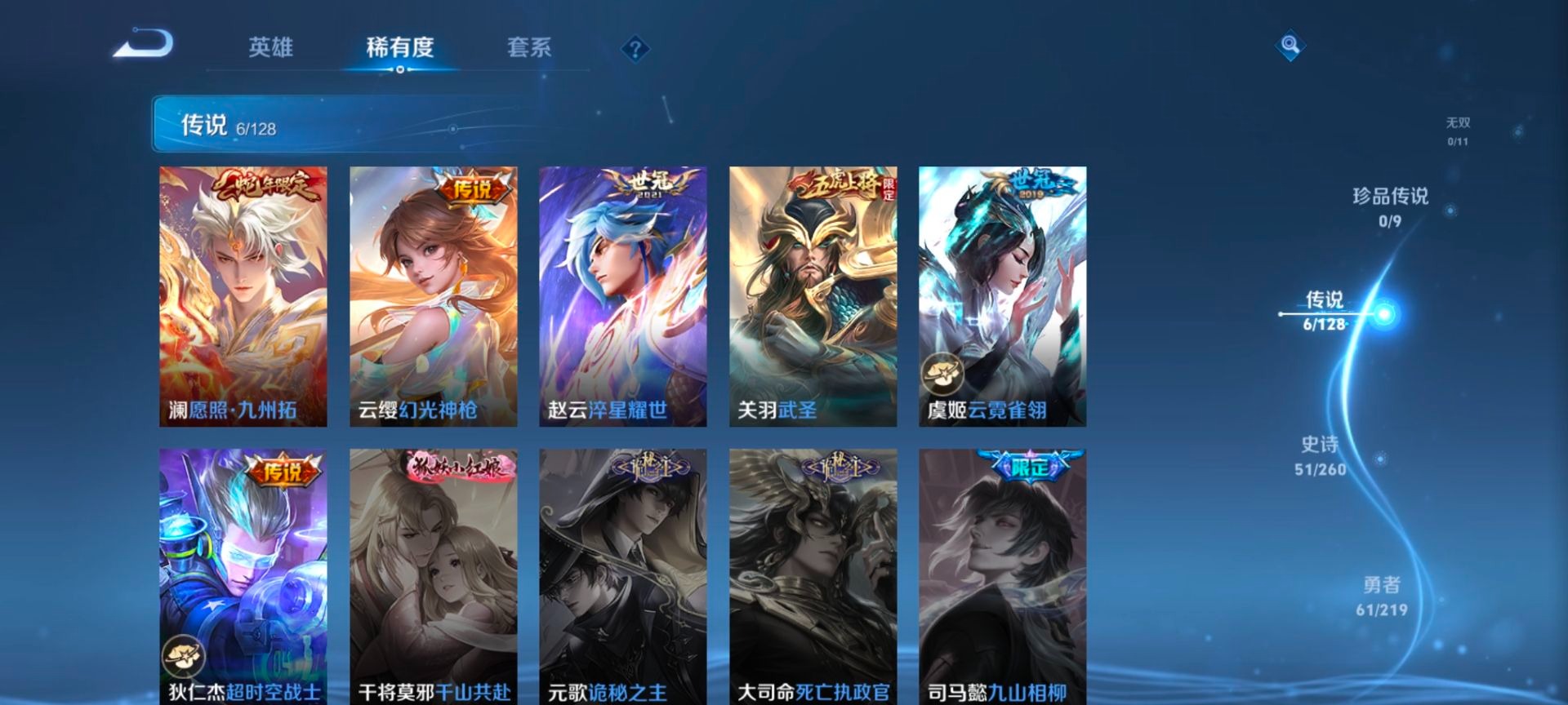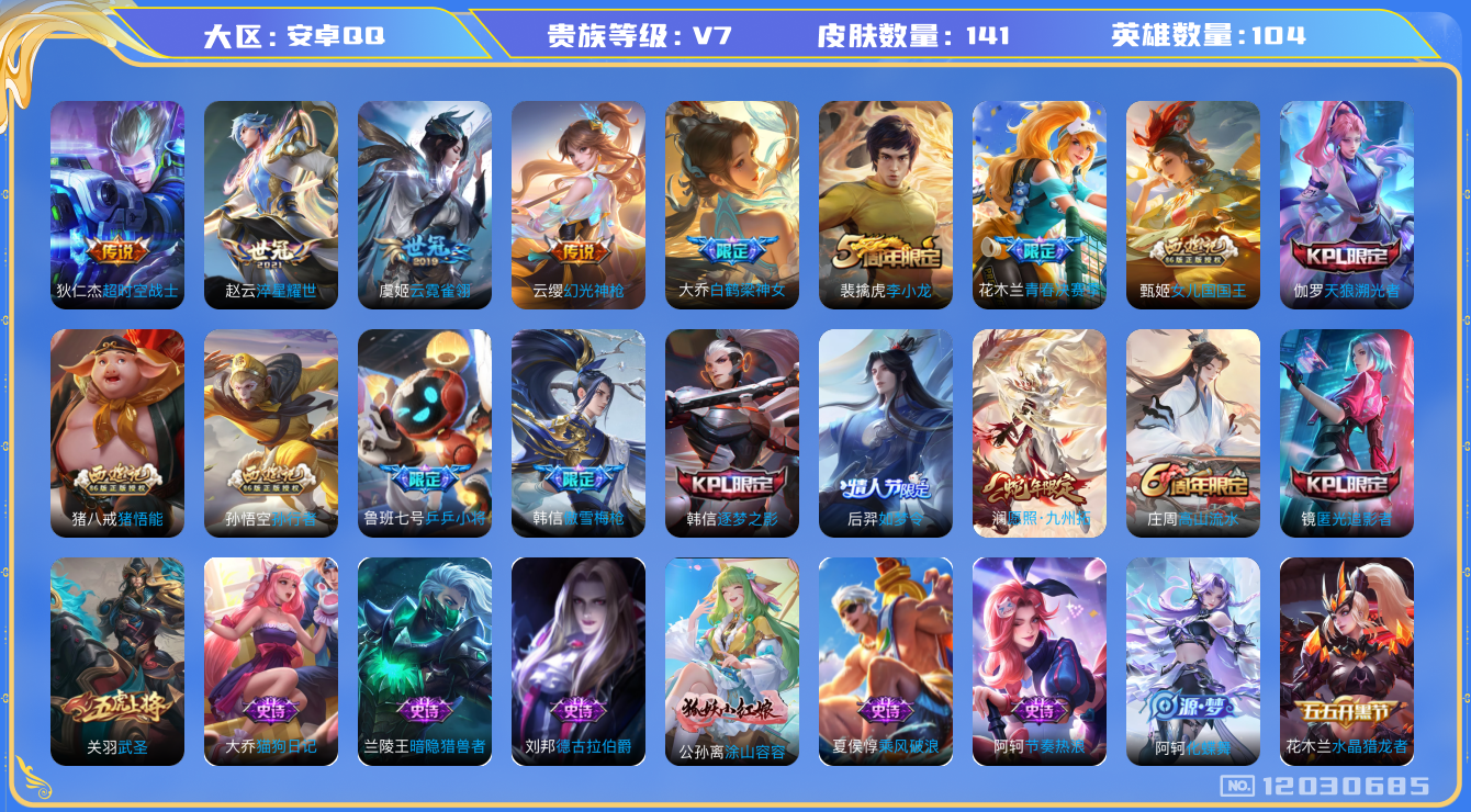 - [11658302]V6 1典藏 1珍品传说 2传说 123英雄 204皮肤 可修改实名 金蝉小国标 荣耀水晶:星域神启(倪克斯贼亮) 珍品传说:怪盗基德 传说皮:冠军飞将 珍宝阁皮:万物之道,蔷薇恋人 限定皮:逐霄战戟,鸣野蒿,遇见飞天,高山流水,五谷丰年,梁祝,孙行者,一生所爱,大圣娶亲 史诗皮:星界战将,器灵·浮梦炉,破空之剑,紫霞仙子,白龙吟,黄金分割率,千年之狐,江河有灵,蒙恬荣光圣徽,冰冠公主,魅语,末日机甲-吕布,乱世虎臣,女仆咖啡,摇滚巨星,水果甜心,天才门将,星夜王子,心灵骇客,时之奇旅-安琪拉,功夫厨神,暗隐猎兽者,幽灵船长,鬼剑武藏,心灵战警,舞动绿茵,缤纷独角兽,逐浪之夏,水晶猎龙者,金属风暴,原初追逐者,圣诞恋歌,鹰眼统帅,魅力维加斯,黎明之约,无心
