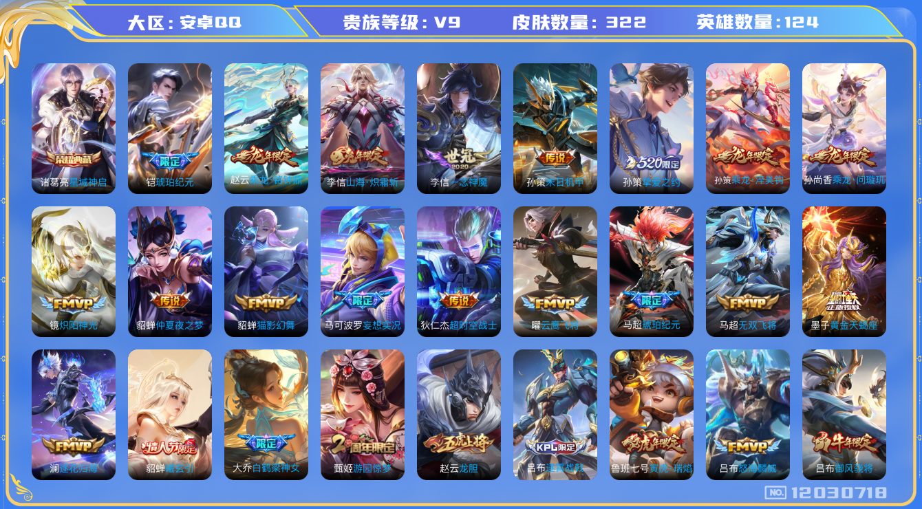 [12030718]V9 1典藏 28传说 124英雄 322皮肤 可修改实名 优质装备:星域神启(倪克斯贼亮),云鹰飞将(小将军),猫影幻舞,炽阳神光,一念神魔,仲夏夜之梦(大飞蛾),超时空战士-狄仁杰,末日机甲-孙策,挚爱之约,无双飞将,山海·炽霜斩(李信年限),妄想实况,澜逐花归海,琥珀纪元铠,琥珀纪元马超,黄金天蝎座 传说皮:乘龙·问璇玑(孙尚香年限),乘龙·铭钟鼎(赵云年限),乘龙·淬吴钩(孙策年限),貂蝉曦玄引 珍宝阁皮:妄想食味,蔷薇恋人,玩趣恶龙 限定皮:愿照·九州拓(澜年限),逐霄战戟,鸣野蒿,傲雪梅枪,前尘镜,白鹤梁神女,时雨天司(水龙头),飞衡(韩信年限),山海·碧波行(瑶年限),高山流水,齐天大圣,怒海麟威,降魔,五谷丰年,游园惊梦,梁祝,御风骁将(吕布年限),龙胆,逐梦之音,李小龙,孙行者,引擎之心,寅虎·瑞焰(虎皮蛋子),寅虎·赤拳(老虎年限),时之奇旅-妲己,神器·万象笔,山海·玄木吟(马可年限) 史诗皮:器灵·浮梦炉,化蝶舞,谪仙醉月,龙之律动,百相守梦-周瑜,芈月浮光幕影,夜落电台,上官婉儿群星魔术团,蔬乡物语(鲁班七号),乘龙·聚宝船(安琪拉年限),乘龙·忆丹青(大乔年限),百相守梦-百里守约,星界特工,百相守梦-黄忠,织梦人,遇见神鹿,紫霞仙子,白龙吟,黄金分割率,特工魅影,千年之狐,江河有灵,匿光侦查者,雪夜绮愿(周瑜),真我赫兹(百里守约),魅语,百解令(蒙犽),高渐离燃音魔法,偶像歌手,电玩·爆裂旋风,龙骑士(小龙虾),末日机甲-吕布,猫狗日记-孙策,乱世虎臣,节奏热浪,修罗,女仆咖啡,水果甜心,绅士熊喵,星夜王子,心灵骇客,功夫厨神,暗隐猎兽者,鬼剑武藏,暗渊魔法,舞动绿茵,地狱岩魂,纤云弄巧,拒霜思,缤纷独角兽,乘风破浪,逐浪之夏,月团寄思,水晶猎龙者,曙光守护者,热力回旋,箭羽风息,唤灵魅影,金属风暴,圣诞狂欢,圣诞恋歌,鹰眼统帅,魅力维加斯,天秀·音浪,无心,未来纪元-赵云