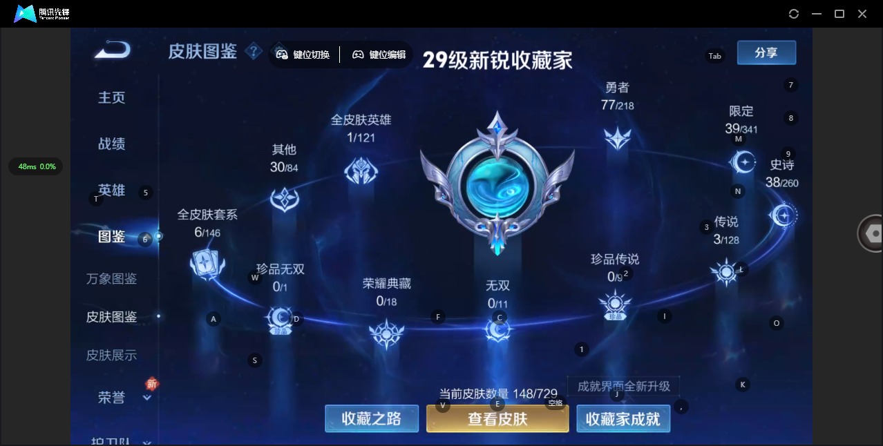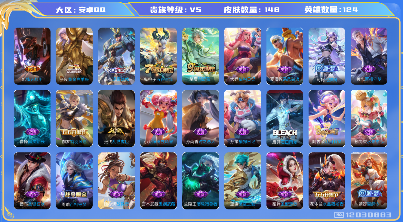 [12030883]V5 3传说 124英雄 148皮肤 可修改实名 优质装备:绛天战甲(鸡嘴战神),黄金白羊座 珍宝阁皮:妄想食味 限定皮:逐霄战戟,鸣野蒿,五谷丰年 史诗皮:化蝶舞,龙之律动,石田雨龙,百相守梦-周瑜,破空之剑,战舞者,百相守梦-百里守约,百相守梦-黄忠,江河有灵,百解令(蒙犽),冰冠公主,偶像歌手,猫狗日记-孙策,猫狗日记-大乔,时之恋人-孙尚香,乱世虎臣,女仆咖啡,摇滚巨星,水果甜心,星夜王子,暗隐猎兽者,幽灵船长,鬼剑武藏,拒霜思,缤纷独角兽,乘风破浪,逐浪之夏,水晶猎龙者,箭羽风息,金属风暴,圣诞狂欢,圣诞恋歌,鹰眼统帅,魅力维加斯