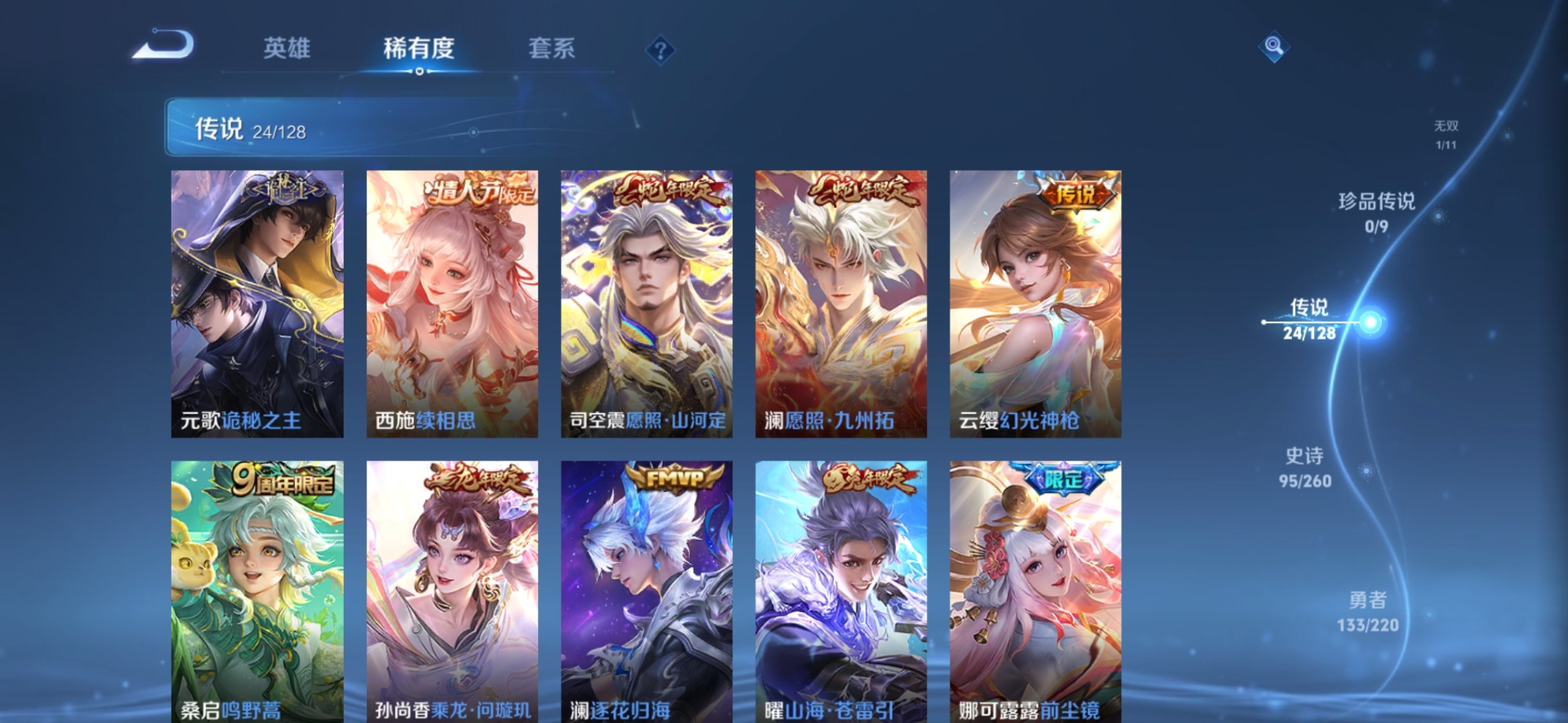 - PX_2095099-贵族6/皮肤106/传说4/史诗24/英雄92/宫本武藏黑崎一护/超时空战士男/胖达荣荣/绛天战甲/澜愿照九州拓/大乔绒语心约/狄仁杰阴阳师/赵云皇家上将/庄周高山流水/扁鹊奇幻香踪/元歌无心/狄仁杰魔术师/项羽海滩派对/刘备百相守梦/云中旅人/杨戬潮玩骑兵/鬼谷子五谷丰年/擒涛扼浪/嫦娥暖冬兔眠/西施玲珑珍味/探海日志/海盐诗旅/暃星界游侠/戈娅驭风魔法/阿古朵江河有灵/古