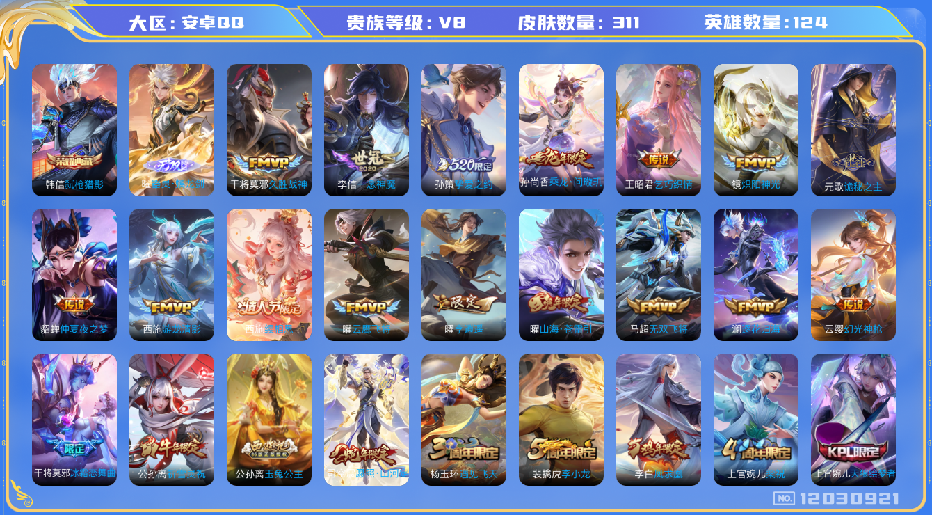 [12030921]V8 1典藏 1无双 24传说 124英雄 311皮肤 可修改实名 优质装备:弑枪猎影(韩信典藏),器灵·螭龙剑,云鹰飞将(小将军),久胜战神,炽阳神光,一念神魔,仲夏夜之梦(大飞蛾),李逍遥,乞巧织情,游龙清影(小青龙),挚爱之约,无双飞将,山海·苍雷引(电光曜子),澜逐花归海,诡秘之主,涂山容容 传说皮:乘龙·问璇玑(孙尚香年限),续相思,幻光神枪 珍宝阁皮:妄想食味,优雅恋人,蔷薇恋人,女武神 限定皮:愿照·九州拓(澜年限),愿照·山河定(司空震年限),鸣野蒿,至尊宝,白虎志(电光耗子),凤求凰(白切鸡),傲雪梅枪,前尘镜,神威(电光马子),飞衡(韩信年限),至美·乘鲤谣,遇见飞天,五谷丰年,梁祝,祈雪灵祝(雪兔子),天狼绘梦者,李小龙,大圣娶亲,冰霜恋舞曲,时之祈愿-云中君,玉兔公主,山海·玄木吟(马可年限) 史诗皮:器灵·浮梦炉,化蝶舞,星界战将,龙之律动,百相守梦-周瑜,破空之剑,涂山红红,东方月初,蔬乡物语(鲁班七号),织梦人,遇见神鹿,紫霞仙子,电玩小子(小书包),黄金分割率,特工魅影,千年之狐,永昼,江河有灵,魅语,百解令(蒙犽),蒙恬荣光圣徽,无限星赏官,冰冠公主,偶像歌手,晚萤,电玩·爆裂旋风,暗夜猫娘,末日机甲-吕布,猫狗日记-孙策,乱世虎臣,节奏热浪,修罗,女仆咖啡,摇滚巨星,水果甜心,绅士熊喵,天才门将,星夜王子,心灵骇客,功夫厨神,德古拉伯爵,暗隐猎兽者,幽灵船长,鬼剑武藏,舞动绿茵,地狱岩魂,诗语江南,纤云弄巧,繁星吟游(呼啦呼啦),拒霜思,缤纷独角兽,乘风破浪,逐浪之夏,月团寄思,水晶猎龙者,曙光守护者,热力回旋,箭羽风息,金属风暴,原初追逐者,圣诞恋歌,鹰眼统帅,魅力维加斯,黎明之约,无心,未来纪元-赵云