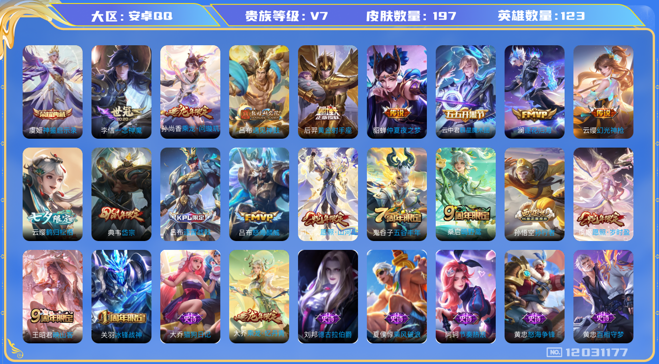 [12031177]V7 1典藏 14传说 123英雄 197皮肤 可修改实名 优质装备:神鉴启示录,黄金射手座,一念神魔,仲夏夜之梦(大飞蛾),鹤归松栖(云缨),遇见神鼓,澜逐花归海,云中君群星魔术团 传说皮:乘龙·问璇玑(孙尚香年限),幻光神枪 珍宝阁皮:优雅恋人 限定皮:愿照·岁时盈(虞姬年限),愿照·山河定(司空震年限),逐霄战戟,映山客,鸣野蒿,怒海麟威,五谷丰年,冰锋战神,岱宗(典韦年限),孙行者 史诗皮:器灵·浮梦炉,星界战将,龙之律动,茶境仙,怒海争锋,破空之剑,上官婉儿群星魔术团,蔬乡物语(鲁班七号),乘龙·聚宝船(安琪拉年限),乘龙·忆丹青(大乔年限),百相守梦-百里守约,百相守梦-黄忠,遇见神鹿,黄金分割率,特工魅影,千年之狐,江河有灵,匿光侦查者,鹤归松栖(赵怀真),百解令(蒙犽),蒙恬荣光圣徽,青蛇,电玩·爆裂旋风,猫狗日记-大乔,乱世虎臣,节奏热浪,女仆咖啡,摇滚巨星,水果甜心,绅士熊喵,功夫厨神,德古拉伯爵,暗隐猎兽者,幽灵船长,鬼剑武藏,心灵战警,乐园奇幻夜,天秀·启明,舞动绿茵,地狱岩魂,诗语江南,拒霜思,乘风破浪,逐浪之夏,水晶猎龙者,曙光守护者,金属风暴,原初追逐者,圣诞狂欢,圣诞恋歌,鹰眼统帅,魅力维加斯,未来纪元-赵云