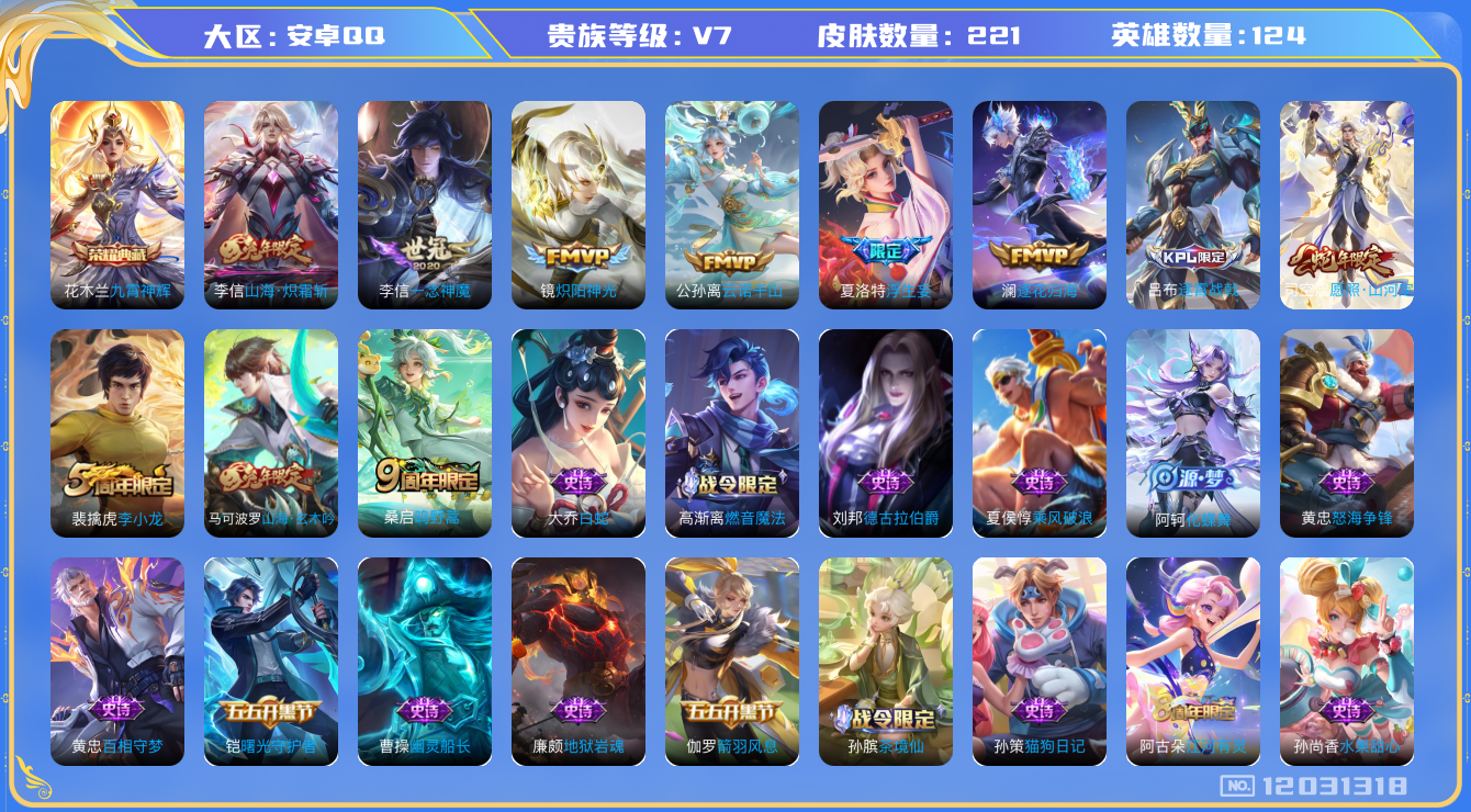 [12031318]V7 1典藏 8传说 124英雄 221皮肤 可修改实名 女号 优质装备:九霄神辉(木兰典藏),炽阳神光,一念神魔,山海·炽霜斩(李信年限),浮生妄,澜逐花归海 传说皮:云诺千山 珍宝阁皮:妄想食味 限定皮:愿照·山河定(司空震年限),逐霄战戟,鸣野蒿,李小龙,山海·玄木吟(马可年限) 史诗皮:飞车小橘子,器灵·浮梦炉,化蝶舞,星界战将,龙之律动,茶境仙,怒海争锋,破空之剑,战舞者,蒙犽顽岩魄,埋骨钱,芈月浮光幕影,蔬乡物语(鲁班七号),百相守梦-百里守约,百相守梦-黄忠,紫霞仙子,白龙吟,特工魅影,永昼,江河有灵,鹤归松栖(赵怀真),百解令(蒙犽),高渐离燃音魔法,蒙恬荣光圣徽,冰冠公主,白蛇,电玩·爆裂旋风,猫狗日记-孙策,修罗,摇滚巨星,水果甜心,星夜王子,心灵骇客,德古拉伯爵,暗隐猎兽者,幽灵船长,鬼剑武藏,心灵战警,天秀·启明,地狱岩魂,纤云弄巧,拒霜思,乘风破浪,逐浪之夏,水晶猎龙者,曙光守护者,箭羽风息,原初追逐者,鹰眼统帅