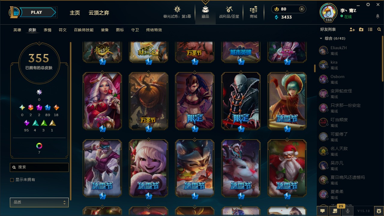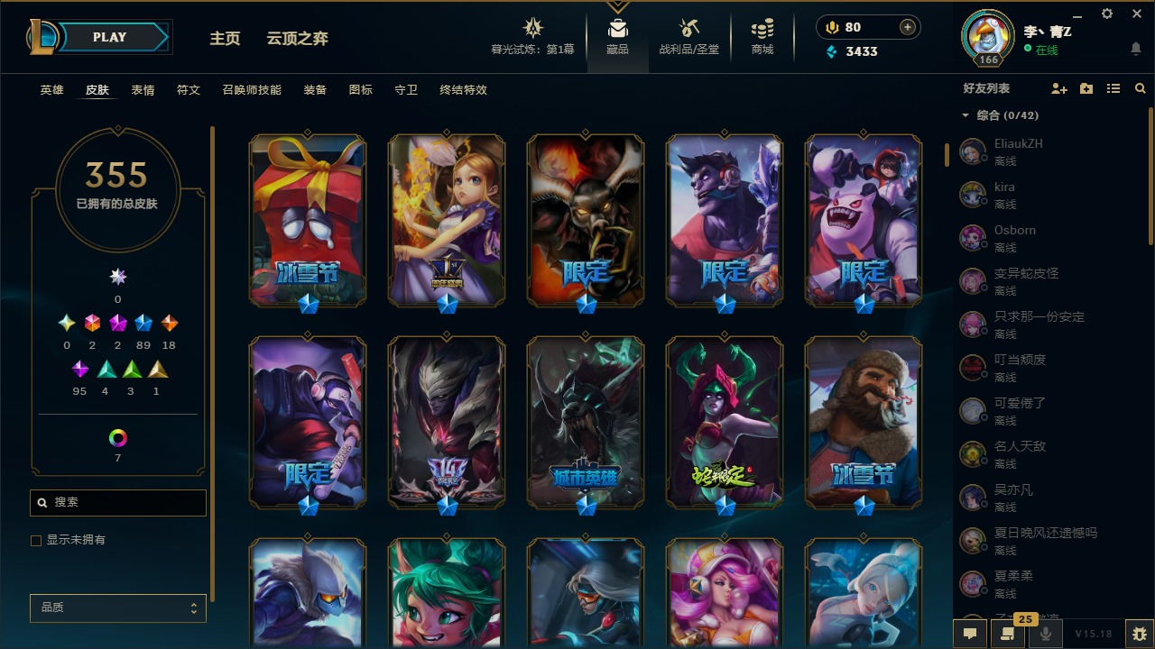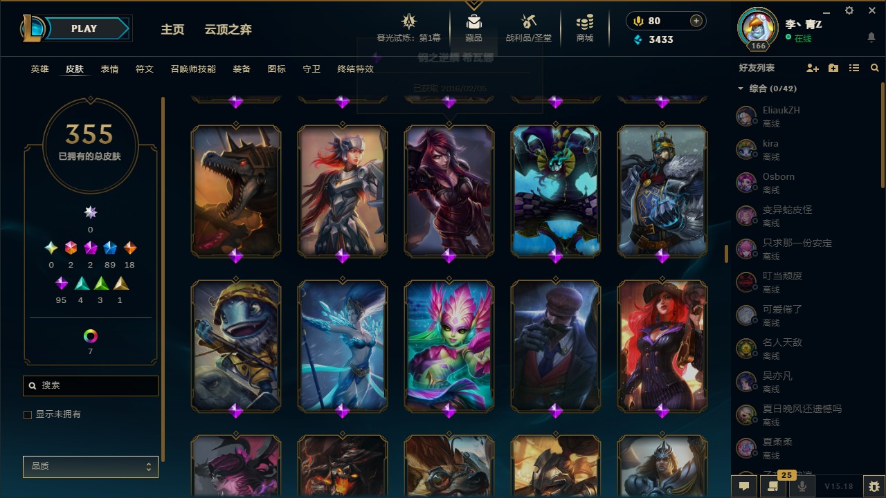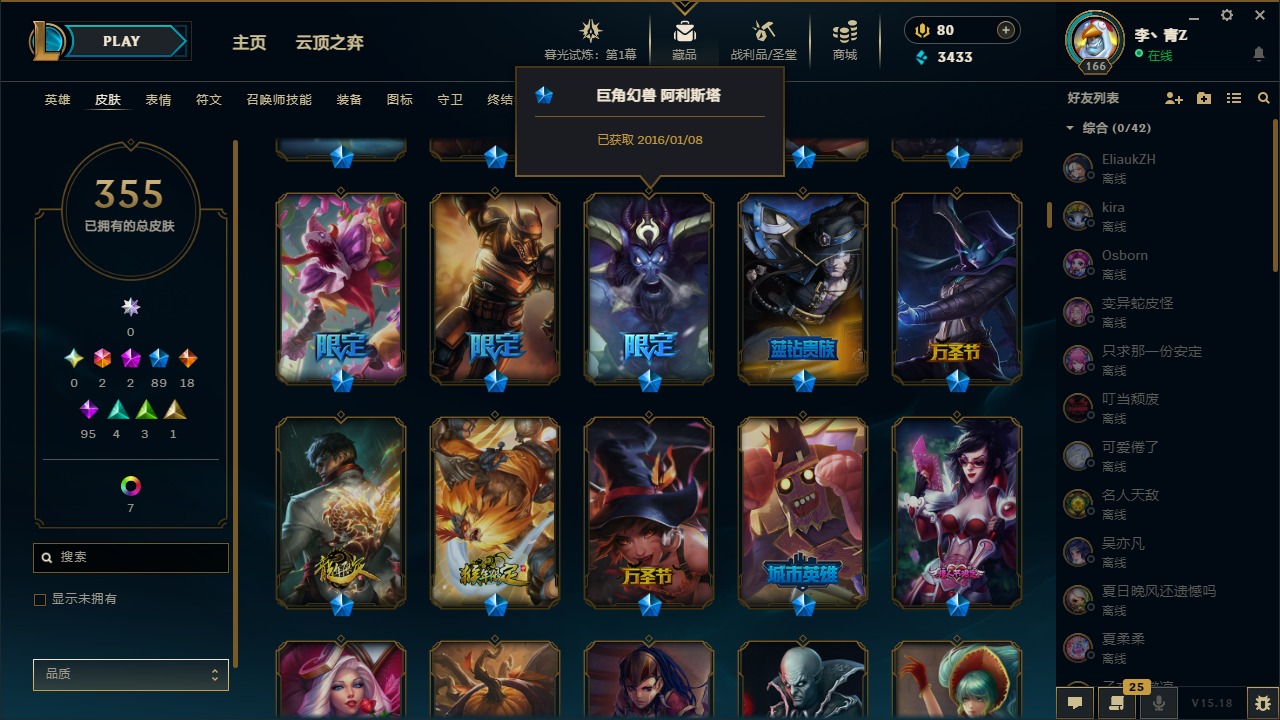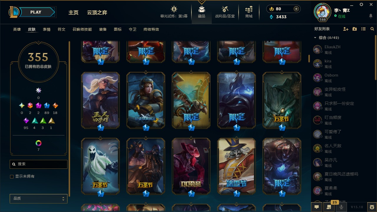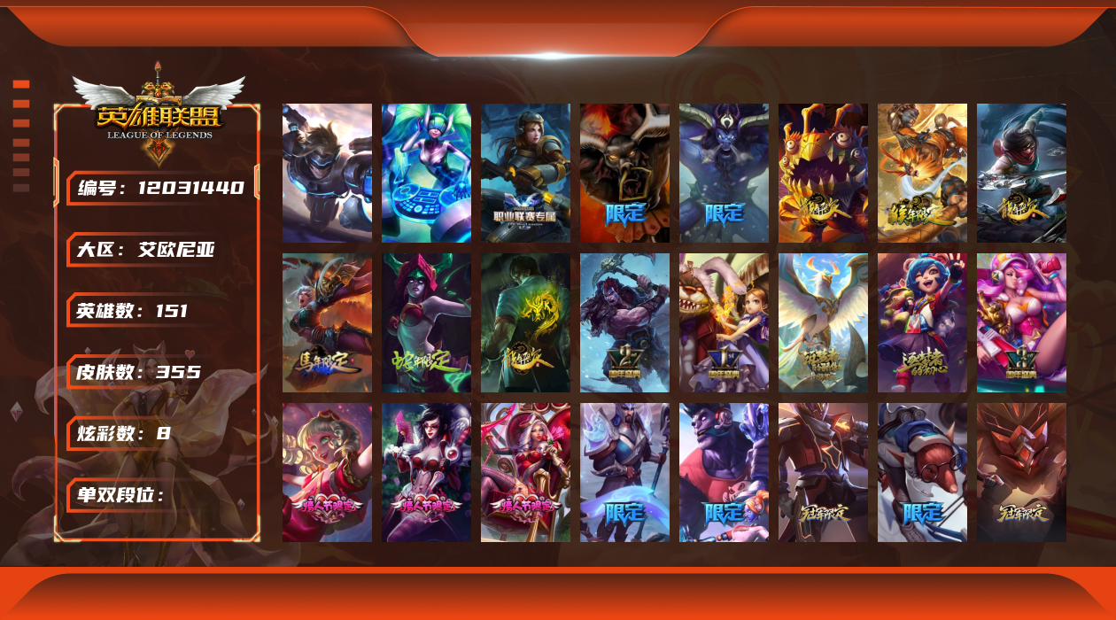 [12031440]2终极 2神话 89限定 18传说 95史诗 355皮肤 8炫彩 151英雄 可二次 可修改实名 优质装备:防爆天使 凯尔,暗影 沃里克,巧克力工坊 波比,创世纪 希维尔,都铎王朝 图奇,夺命美人 卡特,防爆机器人 布里茨,防爆士兵 炼金,防爆士兵 格雷福斯,钢铁之翼 凤凰,冠军之隐 劫,红桃杰克 崔斯特,机械迷城 加里奥,惊悚派对 费德提克,警用试作体K-9 内瑟斯,蓝色忧郁 崔斯特,蒙多蒙多,女猎手 希维尔,诺斯费拉图 弗拉基米尔,糖果使徒 费德提克,未来战士,DJ-娑娜,外星装甲 库奇,银龙裁夬 泰隆 潜龙在渊,暗裔英雄 盖伦 限定:钢铁军团 拉克丝,巨角幻兽 阿利斯塔,暗黑灵魂 阿利斯塔 情人节限定:觅心猎手 薇恩,觅心女王 寒冰,甜心宝贝 安妮 赛季限定皮:胜利之树 茂凯,胜利枪神 格雷福斯,胜利女神 奥利安娜,胜利之剑 剑魔,胜利枪神 卢锡安 冠军限定系列:S13 T1 李青,S1FNC 酒桶,S2 暗杀星 蒙多,S2 暗杀星 努努,S2 暗杀星 慎,S3 SKT T1 劫,S3 SKT T1 薇恩,S3 SKT T1 李青,S3 SKT T1 婕拉,S4 SSW 锤石,S4 SSW 雷恩加尔,S4 SSW 图奇,S4 SSW 炼金,S7 SSG 嘉文四世,S9 FPX 薇恩,S9 FPX 锤石,S9 FPX 李青,S9 FPX 墨菲特,S9 FPX 普朗克 冰雪节限定:“主人不要我了” 阿木木,冰雪节 格雷福斯,冰雪节 马尔扎哈,冬季仙境 发条,胡桃夹子 小丑,平安夜女神 娑娜,魄罗骑士 瑟庄妮,圣诞开心鬼 提莫,圣诞精灵 崔丝塔娜,圣诞狂欢 努努,圣诞老人 酒桶,圣诞糖果棒 厄运小姐,圣诞玩偶 波比,圣诞驯鹿 克格莫,冰雪节 茂凯,邪恶圣诞老人 维迦,幸福女神 乐芙兰,雪默丁格,雪装 奈德丽,英勇玩具兵船长 泳池派对:泳池派对 男枪,泳池派对 李青 万圣节限定:鬼影森森 茂凯,鬼影重重 魔腾,海贼 瑞兹,灵魂收割者 索拉卡,魅惑女巫 奈德丽,南瓜头 费德提克,无头骑士 人马 年限:龙年 克格莫,龙年 泰隆,龙年 李青,蛇年 卡西奥佩娅,马年 锐雯,猴年 孙悟空 周年:1周年 安妮,2周年 德莱厄斯,3周年 厄运小姐,10周年 安妮,10周年 凤凰