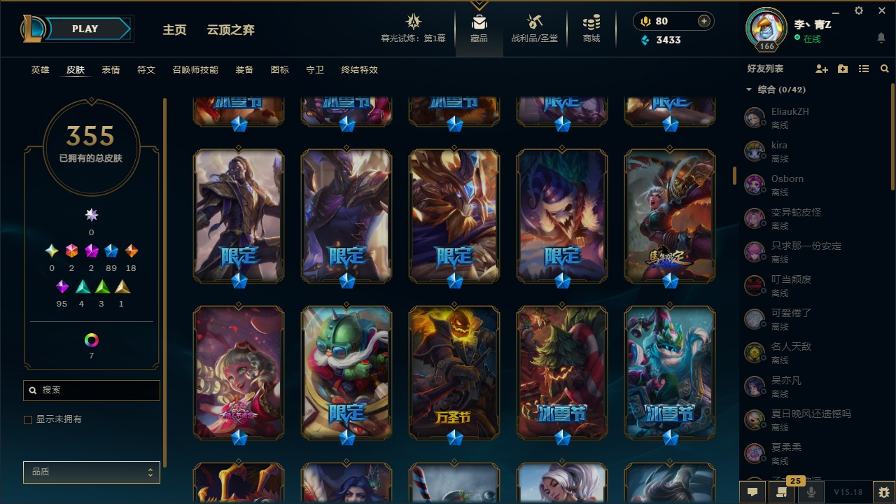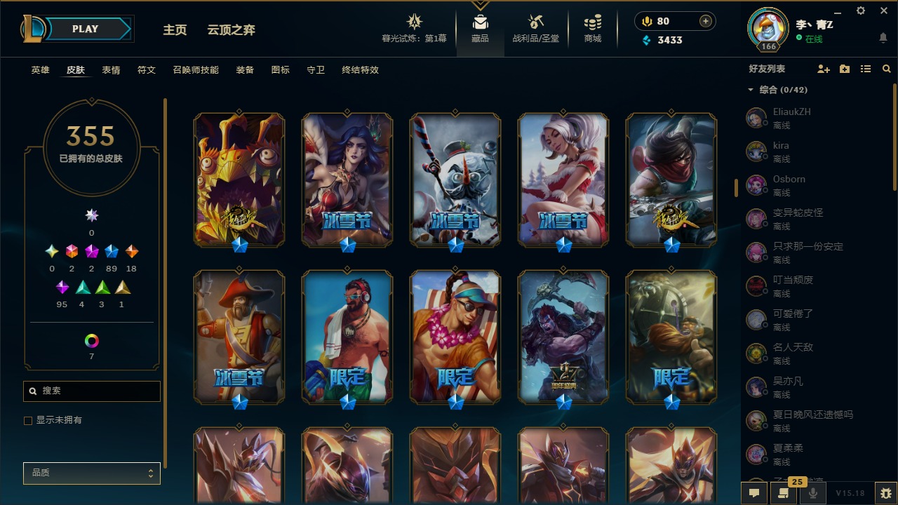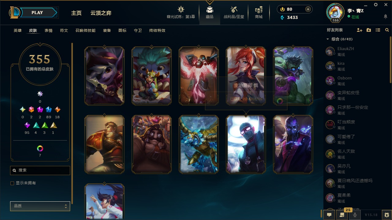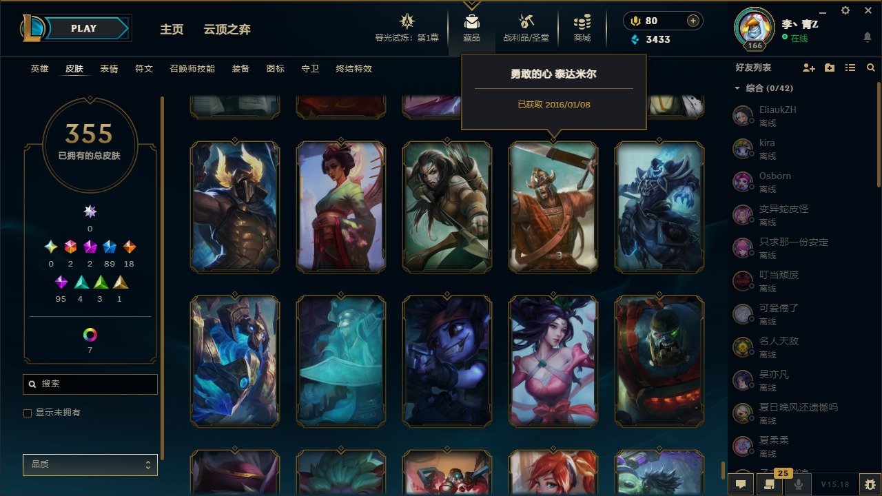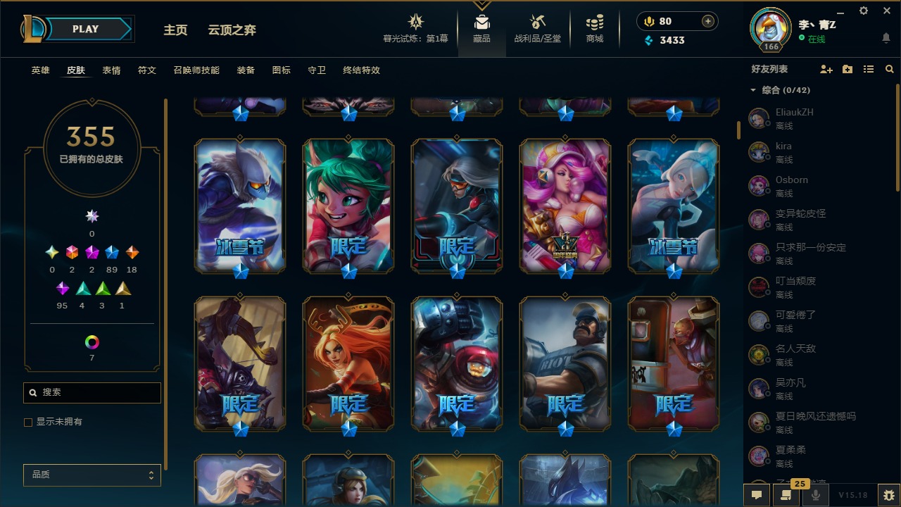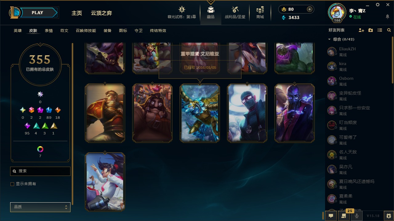 [12031440]2终极 2神话 89限定 18传说 95史诗 355皮肤 8炫彩 151英雄 可二次 可修改实名 优质装备:防爆天使 凯尔,暗影 沃里克,巧克力工坊 波比,创世纪 希维尔,都铎王朝 图奇,夺命美人 卡特,防爆机器人 布里茨,防爆士兵 炼金,防爆士兵 格雷福斯,钢铁之翼 凤凰,冠军之隐 劫,红桃杰克 崔斯特,机械迷城 加里奥,惊悚派对 费德提克,警用试作体K-9 内瑟斯,蓝色忧郁 崔斯特,蒙多蒙多,女猎手 希维尔,诺斯费拉图 弗拉基米尔,糖果使徒 费德提克,未来战士,DJ-娑娜,外星装甲 库奇,银龙裁夬 泰隆 潜龙在渊,暗裔英雄 盖伦 限定:钢铁军团 拉克丝,巨角幻兽 阿利斯塔,暗黑灵魂 阿利斯塔 情人节限定:觅心猎手 薇恩,觅心女王 寒冰,甜心宝贝 安妮 赛季限定皮:胜利之树 茂凯,胜利枪神 格雷福斯,胜利女神 奥利安娜,胜利之剑 剑魔,胜利枪神 卢锡安 冠军限定系列:S13 T1 李青,S1FNC 酒桶,S2 暗杀星 蒙多,S2 暗杀星 努努,S2 暗杀星 慎,S3 SKT T1 劫,S3 SKT T1 薇恩,S3 SKT T1 李青,S3 SKT T1 婕拉,S4 SSW 锤石,S4 SSW 雷恩加尔,S4 SSW 图奇,S4 SSW 炼金,S7 SSG 嘉文四世,S9 FPX 薇恩,S9 FPX 锤石,S9 FPX 李青,S9 FPX 墨菲特,S9 FPX 普朗克 冰雪节限定:“主人不要我了” 阿木木,冰雪节 格雷福斯,冰雪节 马尔扎哈,冬季仙境 发条,胡桃夹子 小丑,平安夜女神 娑娜,魄罗骑士 瑟庄妮,圣诞开心鬼 提莫,圣诞精灵 崔丝塔娜,圣诞狂欢 努努,圣诞老人 酒桶,圣诞糖果棒 厄运小姐,圣诞玩偶 波比,圣诞驯鹿 克格莫,冰雪节 茂凯,邪恶圣诞老人 维迦,幸福女神 乐芙兰,雪默丁格,雪装 奈德丽,英勇玩具兵船长 泳池派对:泳池派对 男枪,泳池派对 李青 万圣节限定:鬼影森森 茂凯,鬼影重重 魔腾,海贼 瑞兹,灵魂收割者 索拉卡,魅惑女巫 奈德丽,南瓜头 费德提克,无头骑士 人马 年限:龙年 克格莫,龙年 泰隆,龙年 李青,蛇年 卡西奥佩娅,马年 锐雯,猴年 孙悟空 周年:1周年 安妮,2周年 德莱厄斯,3周年 厄运小姐,10周年 安妮,10周年 凤凰