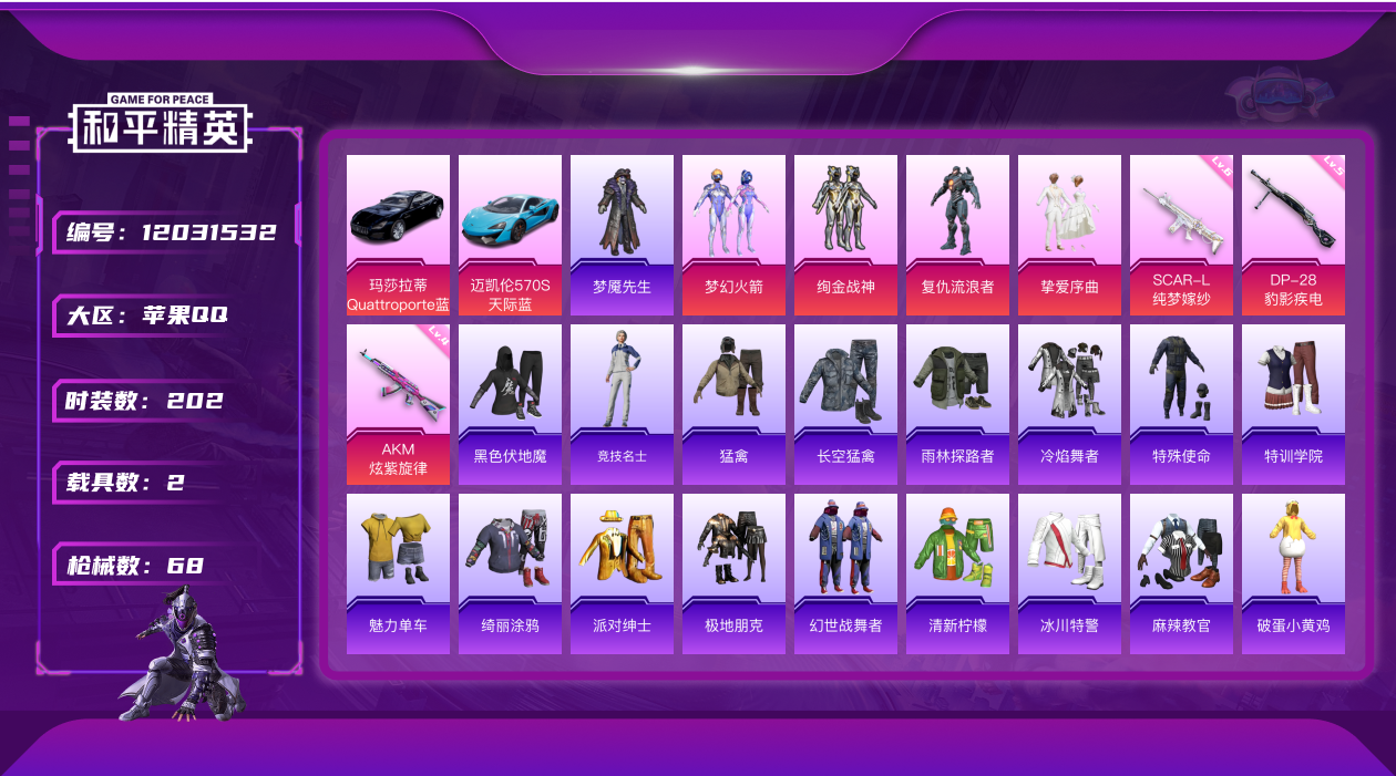 [12031532]4粉装 3特效枪 2载具 4印记 可二次 可修改实名 优质装备:玛莎拉蒂Quattroporte(夜幕蓝),迈凯伦570S(天际蓝),AKM炫紫旋律,梦幻火箭(新101)(新火箭少女101粉色套装),绚金战神,SCAR-L纯梦嫁纱 热门装扮:复仇流浪者,挚爱序曲,梦魇先生 稀有枪皮:DP-28-豹影疾电 六级特效枪:六级SCAR-L-纯梦嫁纱 五级特效枪:五级DP-28-豹影疾电 四级特效枪:四级AKM-炫紫旋律 紫色装扮:SS22特训,SS23特训,幻彩翩翩,妙红点点,龙舌兰冰茶,SS21特训,SS31特训套装,冰川特警,冷焰舞者,SS30特训套装,SS20特训,吉莉礼服,长空猛禽,雨林探路者,霓虹街区,魅力单车,麻辣教官,黑色伏地魔,龙的传人,龟仙人,极地朋克,派对绅士,清新柠檬,幻世战舞者,绮丽涂鸦,破蛋小黄鸡,福星高照,空岛之星,牛气冲天,牛气满满,猛禽,特殊使命,特训学院,鱼渊荷华,都市丽猫,青团波波,糖糖葫芦,竞技名士,深海梦境,惊鸿侠骨,SS25特训,锦衣飞扬,SS27特训,SS26特训,耀粉歌者,SS32特训服(SS32特训套装),青玉碎影,绯格组合 优质战备:千金淑猫降落伞,环太平洋降落伞,纯梦嫁纱降落伞,仲夏莫吉托降落伞,梦幻火箭降落伞,飞行器-炫紫旋律,炫紫旋律降落伞