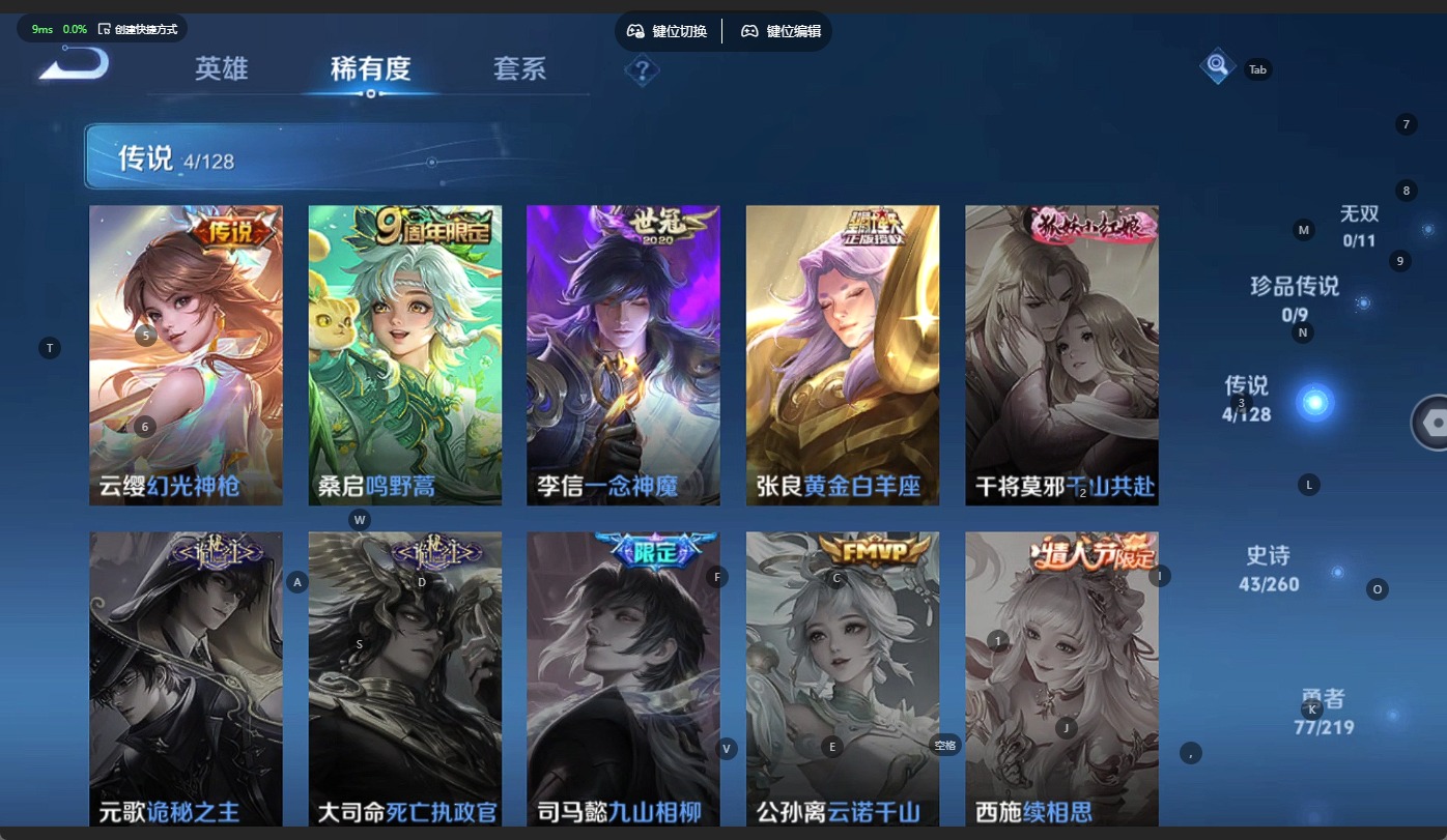 - [11783421]V9 4典藏 16传说 123英雄 263皮肤 可修改实名 优质装备:无限飓风号(高达),鸣剑·曳影,全息碎影(猴子典藏),弑枪猎影(韩信典藏),黄金射手座,云鹰飞将(小将军),一念神魔,仲夏夜之梦(大飞蛾),挚爱之约,无双飞将,碎云,追逃游戏(亚瑟) 传说皮:典韦战鼓燎原,铠冥王哈迪斯 珍宝阁皮:蔷薇恋人,玩趣恶龙 限定皮:愿照·九州拓(澜年限),愿照·岁时盈(虞姬年限),逐霄战戟,鸣野蒿,遇见飞天,高山流水,齐天大圣,五谷丰年,青龙志(铠年限),游园惊梦,梁祝,岱宗(典韦年限),李小龙,如梦令-后羿,默契交锋-花木兰,枫霜尽 史诗皮:器灵·浮梦炉,破空之剑,紫霞仙子,苍穹之光,电玩小子(小书包),白龙吟,黄金分割率,特工魅影,千年之狐,江河有灵,魅语,冰冠公主,青蛇,偶像歌手,暗夜猫娘,龙骑士(小龙虾),末日机甲-吕布,猫狗日记-孙策,时之恋人-孙尚香,乱世虎臣,节奏热浪,修罗,女仆咖啡,摇滚巨星,水果甜心,绅士熊喵,天才门将,星夜王子,心灵骇客,功夫厨神,德古拉伯爵,幽灵船长,鬼剑武藏,暗渊魔法,心灵战警,纤云弄巧,繁星吟游(呼啦呼啦),拒霜思,缤纷独角兽,乘风破浪,逐浪之夏,水晶猎龙者,曙光守护者,箭羽风息,金属风暴,圣诞狂欢,圣诞恋歌,鹰眼统帅,暗夜贵公子,魅力维加斯,赏金猎手,未来纪元-赵云