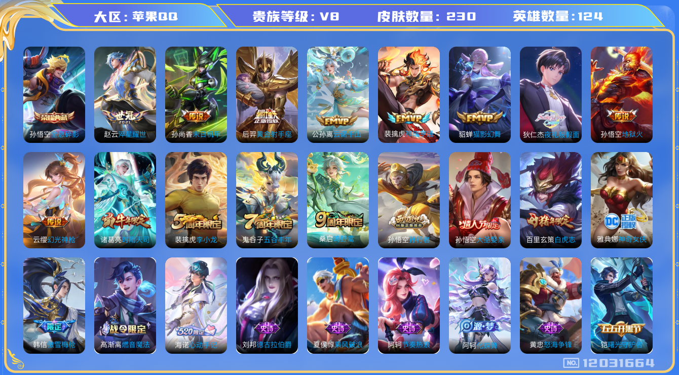 [12031664]V8 1典藏 13传说 124英雄 230皮肤 可修改实名 优质装备:全息碎影(猴子典藏),黄金射手座,猫影幻舞,末日机甲-孙尚香(绿蚂蚱),地狱火,淬星耀世,夜礼服假面 传说皮:云诺千山,祥瑞亨通,幻光神枪 珍宝阁皮:胡桃夹子,优雅恋人 限定皮:鸣野蒿,白虎志(电光耗子),傲雪梅枪,时雨天司(水龙头),五谷丰年,李小龙,孙行者,大圣娶亲,神奇女侠 史诗皮:狼魂孤将,化蝶舞,星界战将,龙之律动,石田雨龙,怒海争锋,东方月初,海诺心动手记,琥珀纪元伽罗,紫霞仙子,特工魅影,千年之狐,江河有灵,百解令(蒙犽),高渐离燃音魔法,冰冠公主,晚萤,猫狗日记-孙策,时之恋人-孙尚香,节奏热浪,修罗,水果甜心,绅士熊喵,星夜王子,心灵骇客,德古拉伯爵,暗隐猎兽者,幽灵船长,鬼剑武藏,暗渊魔法,心灵战警,舞动绿茵,纤云弄巧,拒霜思,乘风破浪,逐浪之夏,水晶猎龙者,曙光守护者,金属风暴,圣诞狂欢,鹰眼统帅,王者之锤,魅力维加斯,黎明之约,无心,未来纪元-赵云