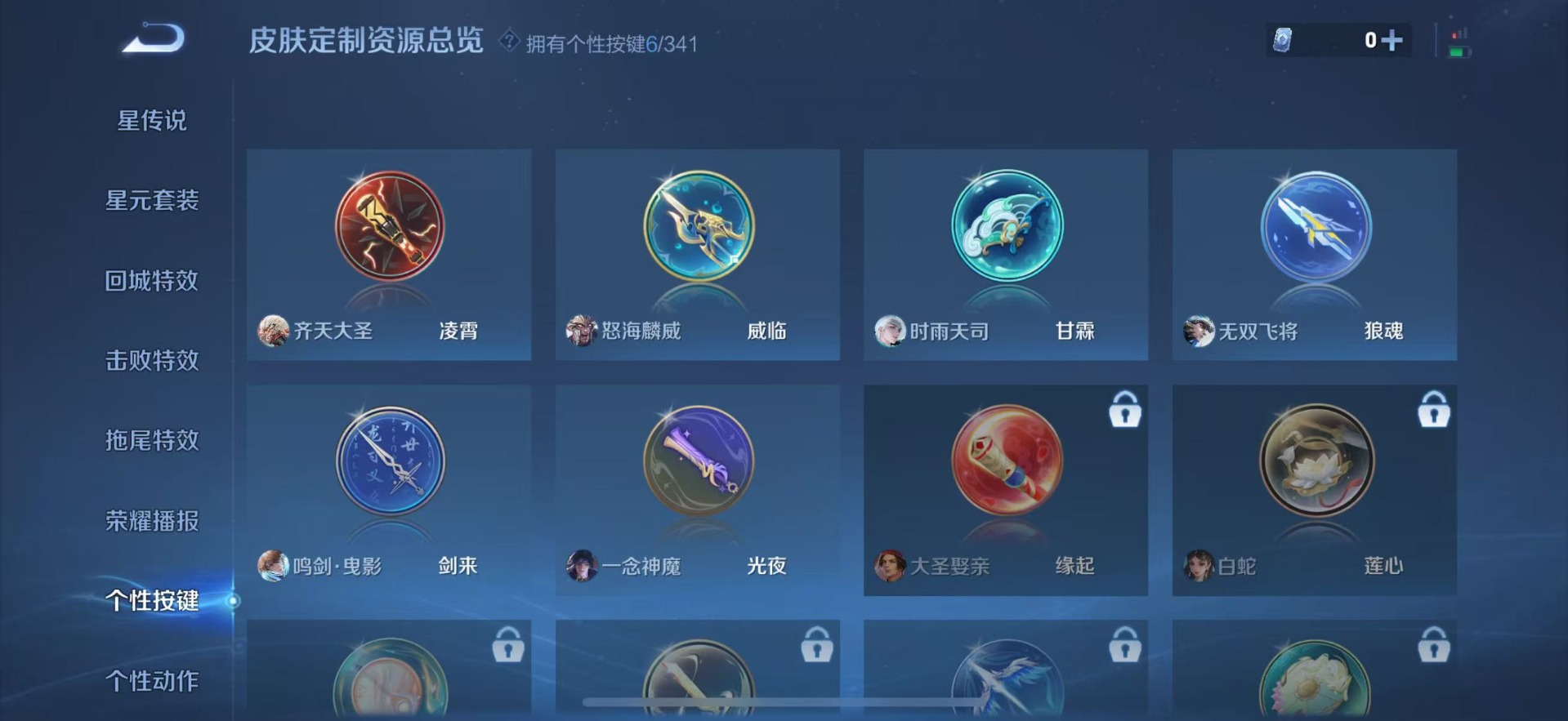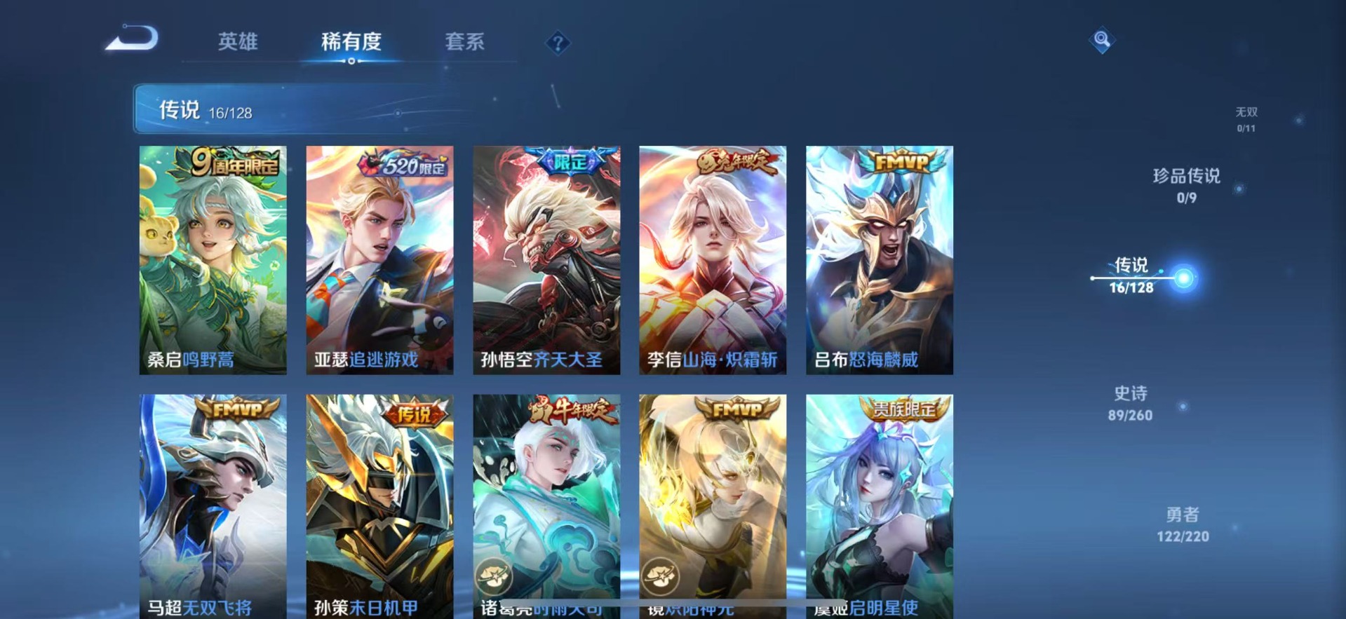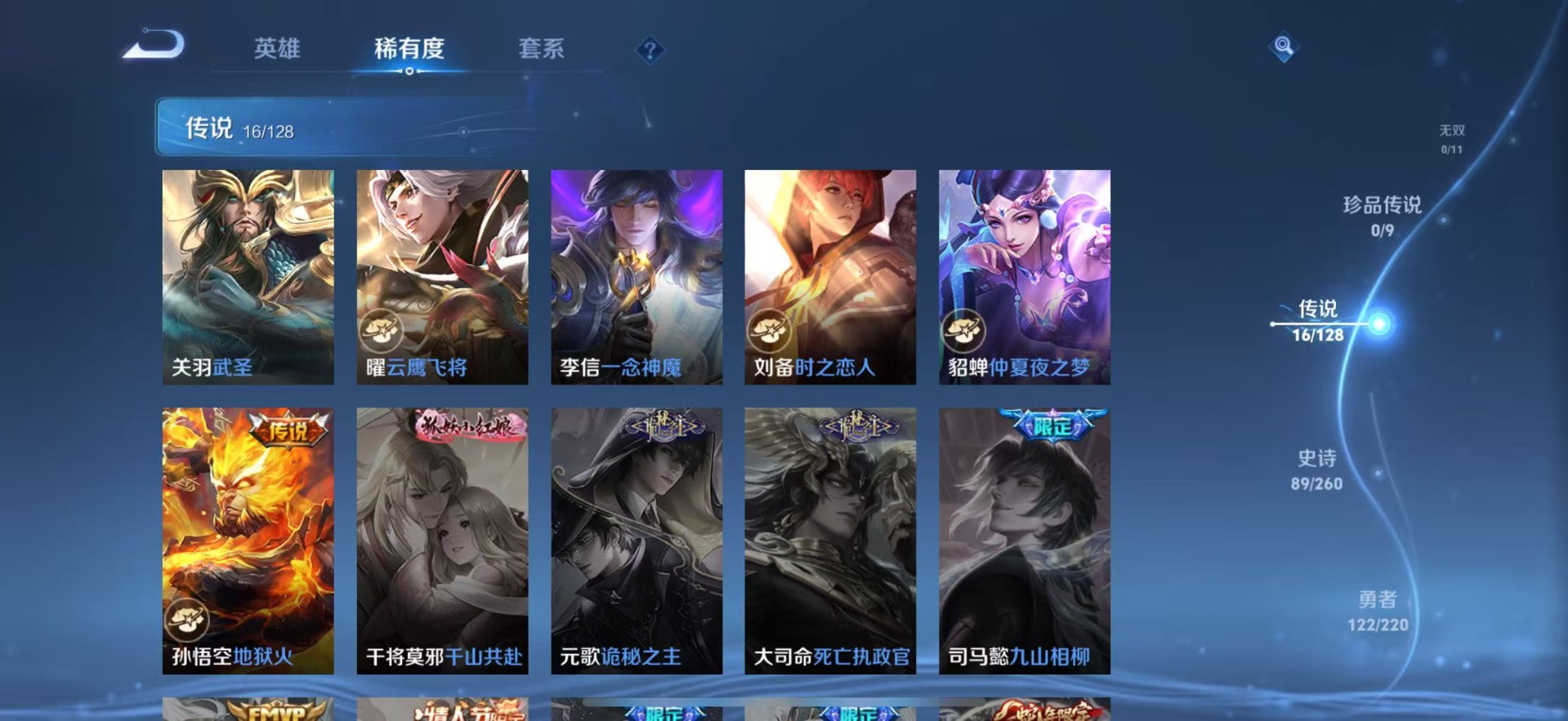 铠青龙志,干将莫邪冰霜恋舞曲,吕布御风骁将,后羿如梦令,露娜一生所爱,诸葛亮时雨天司,裴擒虎李小龙,上官婉儿梁祝,上官婉儿天狼绘梦者,花木兰青春决赛季,桑启鸣野蒿,孙悟空至尊宝,马超神威,韩信飞衡,百里守约朱雀志,关羽武圣