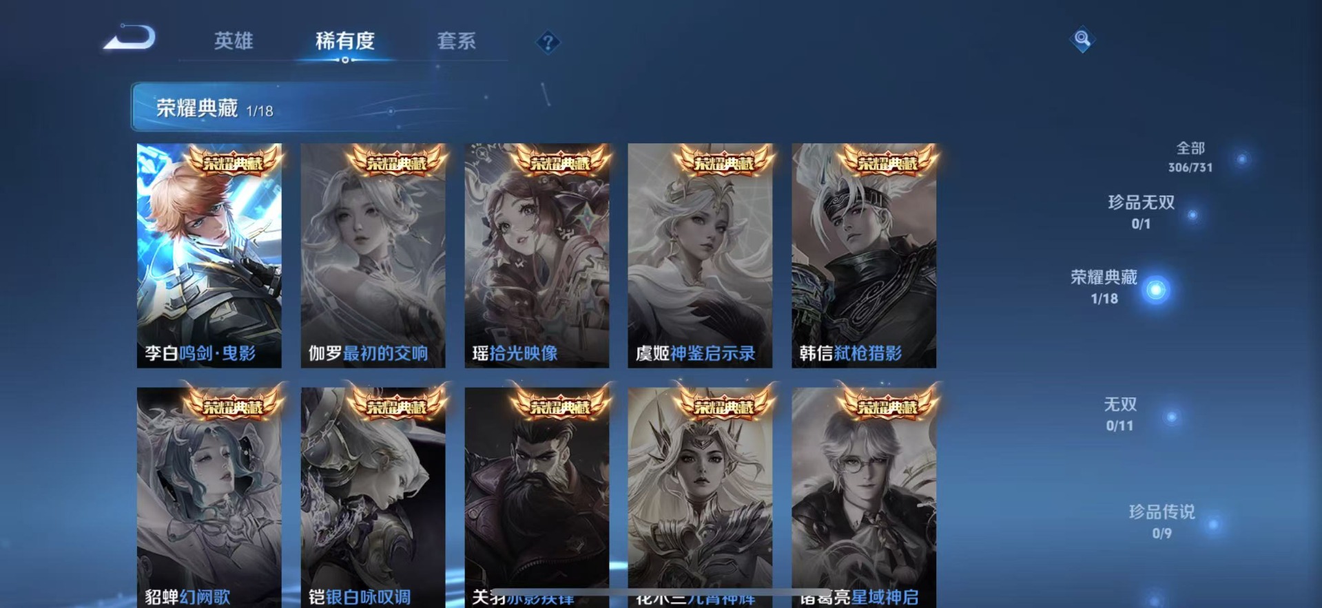 刘邦夺宝奇兵,夏侯惇朔风刀,老夫子醍醐杖,沈梦溪星空之诺,沈梦溪大漠名商,盾山御銮,苏烈千军破阵,达摩沙漠行僧,牛魔御旌,元歌云间偶戏,兰陵王金庭之子,裴擒虎擒涛扼浪,鲁班大师探海日志,明世隐疑决卦,蒙犽狂想玩偶喵,马可波罗暗影游猎,鬼谷子原初探秘者,张良古海寻踪,桑启海盐诗旅,狄仁杰万华元夜,程咬金演武夺筹,李元芳银河之约,李元芳云中旅人,弈星混沌棋,米莱狄御霄,钟馗驱傩正仪,狂铁御狮