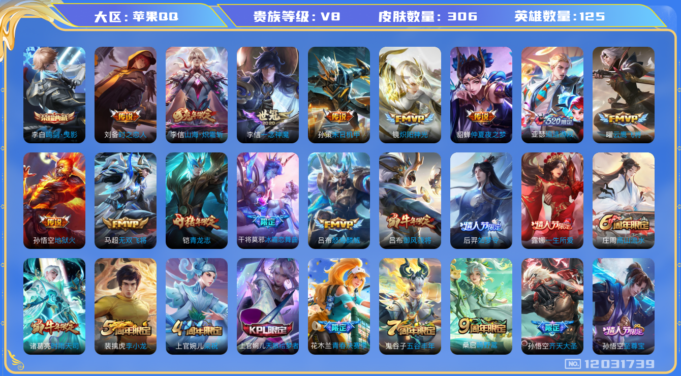 - [11294919]实名: 可修改 贵族等级: V9 英雄数: 125 皮肤数: 261 荣耀水晶: 鸣剑·曳影 无双皮: 器灵·螭龙剑 传说皮: 绛天战甲,炽阳神光,一念神魔,云霓雀翎,末日机甲-孙尚香,地狱火,零号·赤焰,地狱之眼,时之恋人-刘备,无双飞将,山海·炽霜斩,山海·苍雷引,妄想实况,鹤归松栖(云缨),幻光神枪,祥瑞亨通 限定皮: 李小龙,祈雪灵祝,梁祝,御风骁将,时雨天司,龙胆,烈魂,白晶晶,飞衡,凤求凰,至尊宝,默契交锋-兰陵王,默契交锋-花木兰,深海之息,枫霜尽,五谷丰年,诗剑行,山海·玄木吟,鸣野蒿,愿照·九州拓
