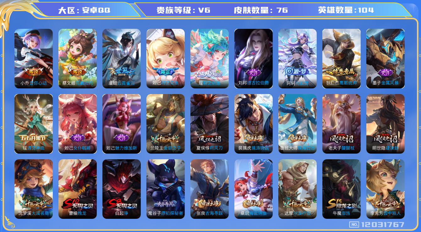 - [11599280]V7 13传说 121英雄 174皮肤 可修改实名 优质装备:黄金射手座,云鹰飞将(小将军),绛天战甲(鸡嘴战神),猫影幻舞,一念神魔,云霓雀翎,地狱之眼,末日机甲-孙策,碎云,霜月吟 传说皮:幻光神枪 珍宝阁皮:妄想食味 限定皮:愿照·九州拓(澜年限),逐霄战戟,鸣野蒿,五谷丰年,梁祝,天狼狩猎者,岱宗(典韦年限),孙行者 史诗皮:化蝶舞,星界特工,茶境仙,破空之剑,蔬乡物语(鲁班七号),百相守梦-百里守约,电玩小子(小书包),特工魅影,千年之狐,电玩·爆裂旋风,江河有灵,高渐离燃音魔法,白蛇,冰冠公主,末日机甲-吕布,猫狗日记-大乔,节奏热浪,修罗,绅士熊喵,天才门将,星夜王子,功夫厨神,德古拉伯爵,暗隐猎兽者,幽灵船长,鬼剑武藏,心灵战警,天秀·启明,乘风破浪,水晶猎龙者,曙光守护者,箭羽风息,金属风暴,圣诞狂欢,圣诞恋歌,鹰眼统帅,未来纪元-赵云