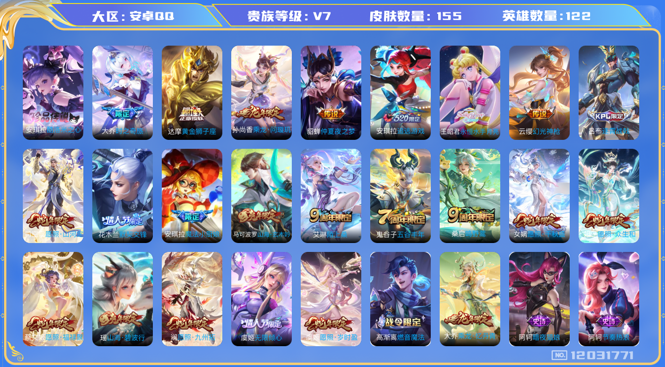 [12031771]V7 1珍品传说 15传说 122英雄 155皮肤 可修改实名 女号 优质装备:酷洛米之心,黄金狮子座,仲夏夜之梦(大飞蛾),追逃游戏(安琪拉),大乔-时之奇旅,永恒水手月亮,涂山容容 传说皮:乘龙·问璇玑(孙尚香年限),幻光神枪 珍宝阁皮:蔷薇恋人 限定皮:愿照·九州拓(澜年限),愿照·福禄聚(蔡文姬年限),愿照·岁时盈(虞姬年限),愿照·山河定(司空震年限),愿照·众生和(妲己年限),愿照·千秋盛(女娲年限),逐霄战戟,陌上桑,鸣野蒿,魔法小厨娘,山海·碧波行(瑶年限),无限倾心-虞姬,五谷丰年,默契交锋-花木兰,山海·玄木吟(马可年限) 史诗皮:化蝶舞,乘龙·聚宝船(安琪拉年限),乘龙·忆丹青(大乔年限),织梦人,遇见神鹿,电玩小子(小书包),黄金分割率,特工魅影,江河有灵,百解令(蒙犽),高渐离燃音魔法,青蛇,偶像歌手,暗夜猫娘,银翎春语,猫狗日记-孙策,节奏热浪,女仆咖啡,水果甜心,星夜王子,心灵骇客,时之奇旅-安琪拉,暗隐猎兽者,舞动绿茵,地狱岩魂,纤云弄巧,拒霜思,缤纷独角兽,金属风暴,鹰眼统帅,无心