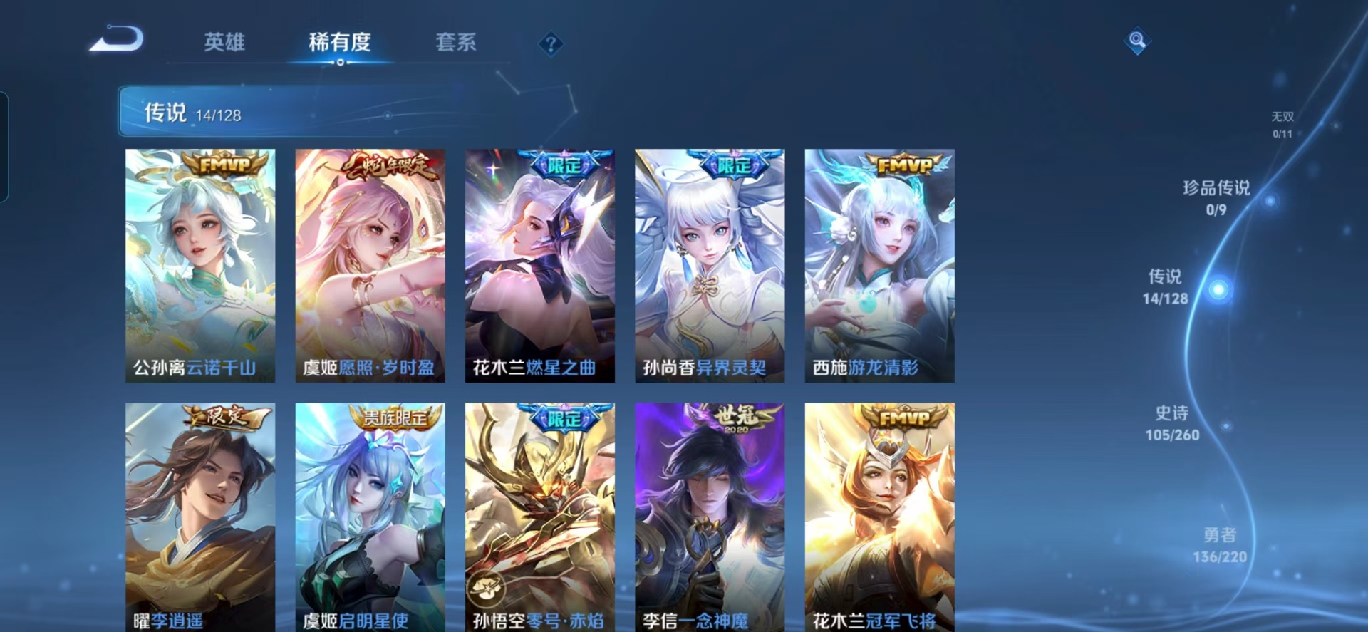 金蝉唐三藏,夏侯惇匿光决锋者,廉颇寅虎·御盾,伽罗天狼溯光者,孙膑寅虎·展翼,干将莫邪冰霜恋舞曲,孙尚香异界灵契,项羽霸王别姬,吕布御风骁将,后羿如梦令,露娜一生所爱,公孙离蜜橘之夏,裴擒虎李小龙,裴擒虎天狼狩猎者,上官婉儿梁祝,上官婉儿神器·万象笔,花木兰青春决赛季,安琪拉魔法小厨娘,马可波罗山海·玄木吟,猪八戒猪悟能,孙悟空孙行者,马超神威,韩信傲雪梅枪,虞姬霸王别姬,虞姬愿照·岁时盈