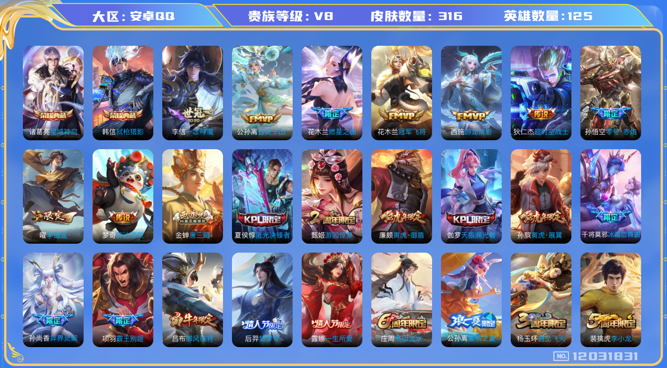 [12031831]V8 2典藏 14传说 125英雄 316皮肤 可修改实名 优质装备:星域神启(倪克斯贼亮),弑枪猎影(韩信典藏),冠军飞将,一念神魔,零号·赤焰,胖达荣荣,李逍遥,游龙清影(小青龙),超时空战士-狄仁杰,燃星之曲,涂山容容 传说皮:云诺千山 珍宝阁皮:妄想食味,优雅恋人,蔷薇恋人 限定皮:愿照·岁时盈(虞姬年限),凤求凰(白切鸡),异界灵契(白毛香),傲雪梅枪,寅虎·展翼(孙膑年限),魔法小厨娘,神威(电光马子),遇见飞天,高山流水,匿光决锋者,五谷丰年,游园惊梦,梁祝,御风骁将(吕布年限),天狼狩猎者,天狼溯光者,李小龙,永曜之星,如梦令-后羿,霸王别姬-项羽,霸王别姬-虞姬,孙行者,猪悟能,一生所爱,青春决赛季,冰霜恋舞曲,蜜橘之夏,寅虎·御盾(廉颇年限),唐三藏,神器·万象笔,山海·玄木吟(马可年限) 史诗皮:器灵·浮梦炉,龙之律动,石田雨龙,海诺心动手记,百相守梦-黄忠,织梦人,守夜人,遇见神鹿,苍穹之光,电玩小子(小书包),特工魅影,千年之狐,永昼,江河有灵,魅语,冰冠公主,偶像歌手,晚萤,百相守梦(刘备),暗夜猫娘,百相守梦(关羽),末日机甲-吕布,猫狗日记-孙策,节奏热浪,修罗,女仆咖啡,摇滚巨星,水果甜心,绅士熊喵,星夜王子,心灵骇客,功夫厨神,德古拉伯爵,暗隐猎兽者,幽灵船长,鬼剑武藏,暗渊魔法,心灵战警,地狱岩魂,纤云弄巧,繁星吟游(呼啦呼啦),拒霜思,缤纷独角兽,乘风破浪,逐浪之夏,水晶猎龙者,曙光守护者,热力回旋,箭羽风息,金属风暴,圣诞恋歌,鹰眼统帅,王者之锤,魅力维加斯,奇遇舞章,寅虎·御盾,顽趣-阿古朵,无心,未来纪元-赵云