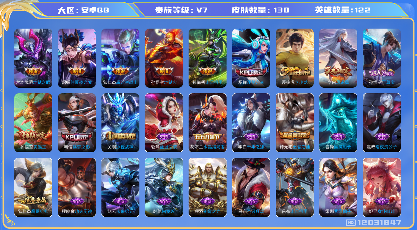[12031847]V7 6传说 122英雄 130皮肤 可修改实名 优质装备:末日机甲-孙尚香(绿蚂蚱),地狱火,仲夏夜之梦(大飞蛾),地狱之眼,超时空战士-狄仁杰 限定皮:至尊宝,凤求凰(白切鸡),冰锋战神,逐梦之音,李小龙,逐梦之影,美猴王 史诗皮:紫霞仙子,苍穹之光,白龙吟,黄金分割率,千年之狐,末日机甲-吕布,女仆咖啡,天才门将,功夫厨神,幽灵船长,水晶猎龙者,圣诞狂欢,圣诞恋歌,鹰眼统帅,王者之锤,暗夜贵公子,魅力维加斯,未来纪元-赵云