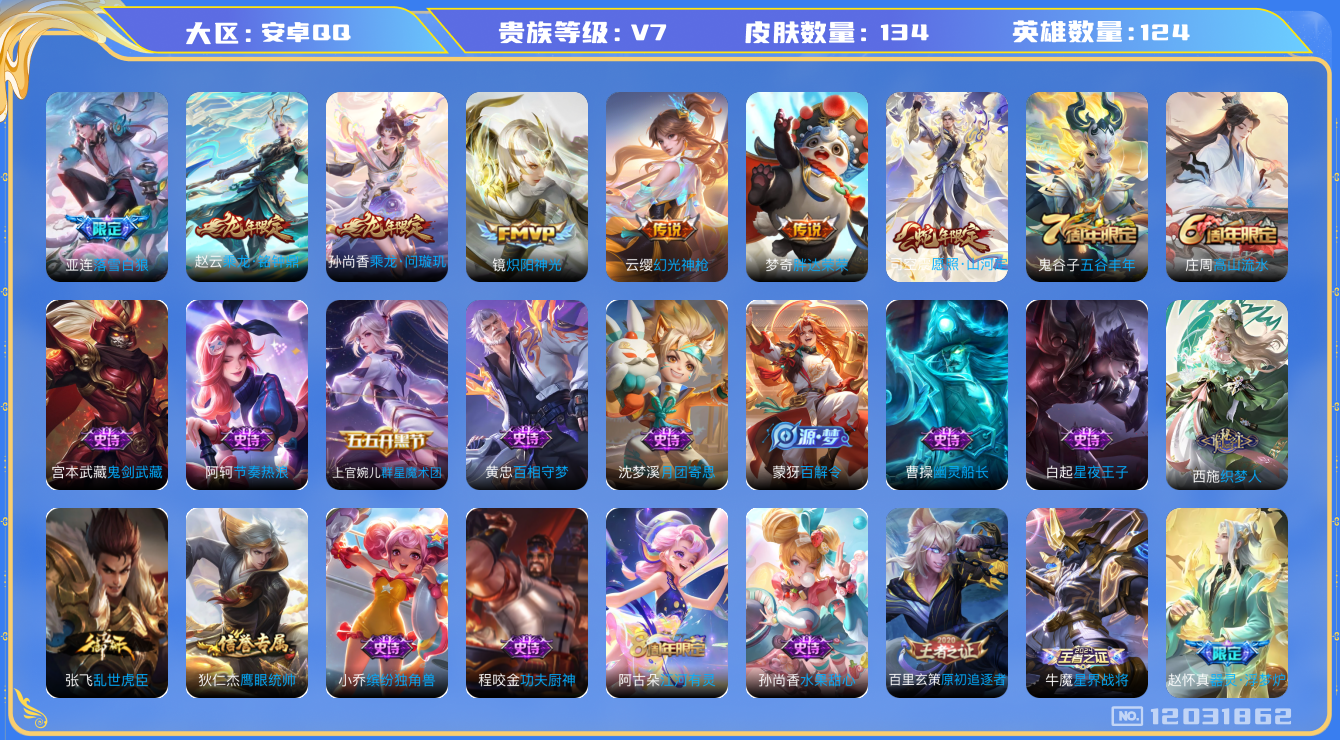 [12031862]V7 7传说 124英雄 134皮肤 可修改实名 司马懿小国标 优质装备:炽阳神光,胖达荣荣 传说皮:乘龙·问璇玑(孙尚香年限),乘龙·铭钟鼎(赵云年限),落雪白狼,幻光神枪 珍宝阁皮:蔷薇恋人 限定皮:愿照·山河定(司空震年限),高山流水,五谷丰年 史诗皮:器灵·浮梦炉,星界战将,龙之律动,东方月初,上官婉儿群星魔术团,百相守梦-黄忠,织梦人,紫霞仙子,特工魅影,江河有灵,百解令(蒙犽),蒙恬荣光圣徽,龙骑士(小龙虾),乱世虎臣,节奏热浪,水果甜心,星夜王子,功夫厨神,幽灵船长,鬼剑武藏,暗渊魔法,缤纷独角兽,逐浪之夏,月团寄思,金属风暴,原初追逐者,圣诞狂欢,鹰眼统帅,黎明之约