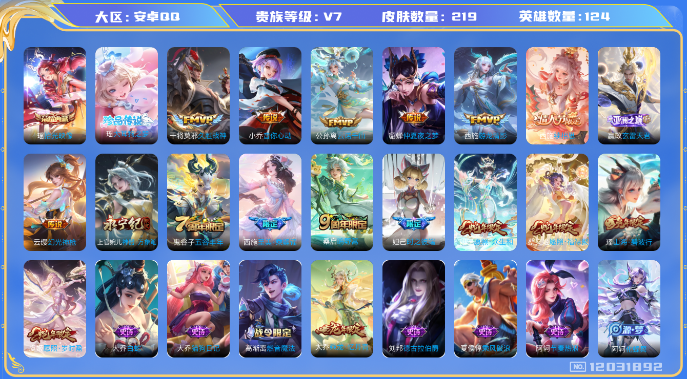 [12031892]V7 1典藏 1珍品传说 12传说 124英雄 219皮肤 可修改实名 女号 优质装备:拾光映像(瑶典藏),大耳狗之梦,久胜战神,仲夏夜之梦(大飞蛾),音你心动-小乔,游龙清影(小青龙),玄雷天君,涂山容容 传说皮:云诺千山,续相思,幻光神枪 珍宝阁皮:妄想食味,优雅恋人,蔷薇恋人 限定皮:愿照·福禄聚(蔡文姬年限),愿照·岁时盈(虞姬年限),愿照·众生和(妲己年限),鸣野蒿,时之彼端,山海·碧波行(瑶年限),至美·乘鲤谣,五谷丰年,神器·万象笔 史诗皮:化蝶舞,谪仙醉月,石田雨龙,茶境仙,破空之剑,涂山红红,蒙犽顽岩魄,芈月浮光幕影,蔬乡物语(鲁班七号),乘龙·忆丹青(大乔年限),百相守梦-百里守约,星界特工,织梦人,遇见神鹿,紫霞仙子,电玩小子(小书包),江河有灵,魅语,百解令(蒙犽),高渐离燃音魔法,无限星赏官,冰冠公主,青蛇,白蛇,晚萤,末日机甲-吕布,猫狗日记-孙策,猫狗日记-大乔,乱世虎臣,节奏热浪,女仆咖啡,水果甜心,星夜王子,心灵骇客,功夫厨神,德古拉伯爵,暗隐猎兽者,鬼剑武藏,心灵战警,舞动绿茵,诗语江南,纤云弄巧,拒霜思,缤纷独角兽,乘风破浪,水晶猎龙者,曙光守护者,唤灵魅影,原初追逐者,圣诞恋歌,鹰眼统帅,暗夜贵公子,魅力维加斯,无心,未来纪元-赵云