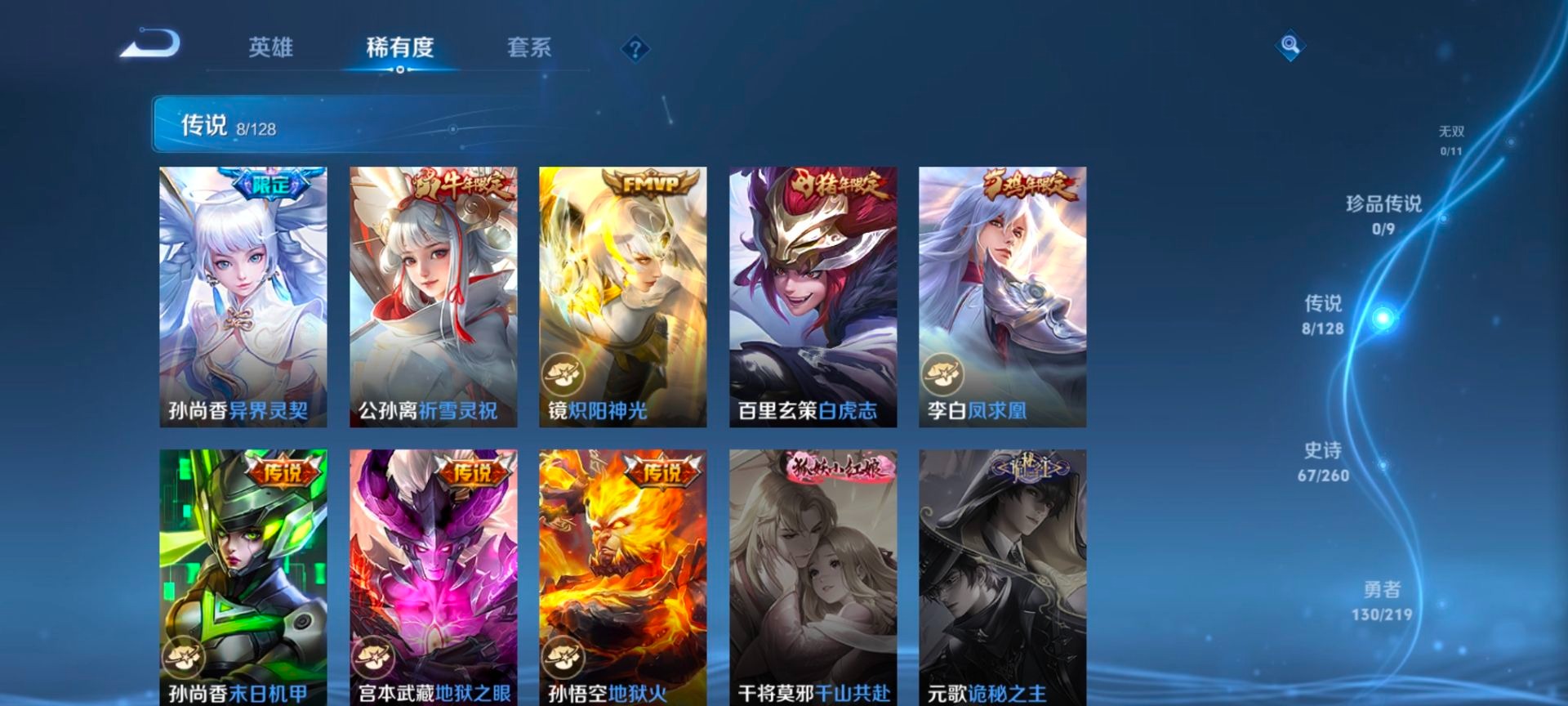 孙尚香异界灵契,公孙离祈雪灵祝,裴擒虎李小龙,裴擒虎天狼狩猎者,上官婉儿梁祝,孙悟空大圣娶亲,孙悟空至尊宝,孙悟空美猴王,百里玄策白虎志,韩信逐梦之影,关羽冰锋战神