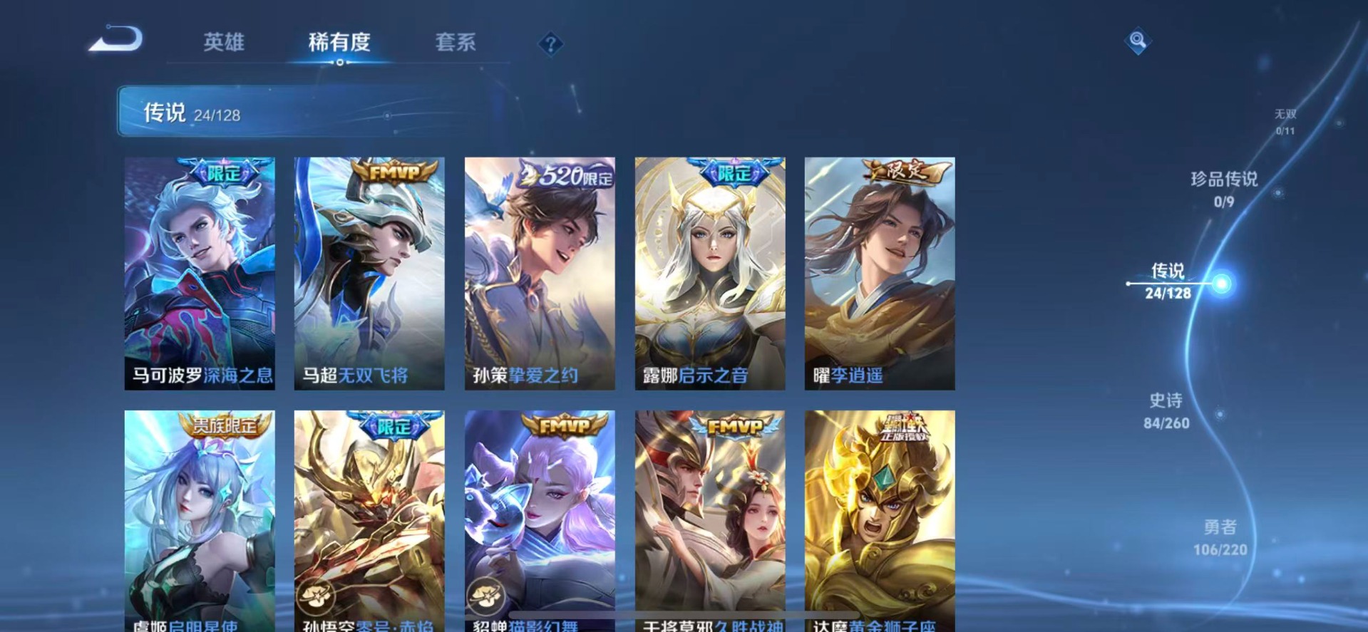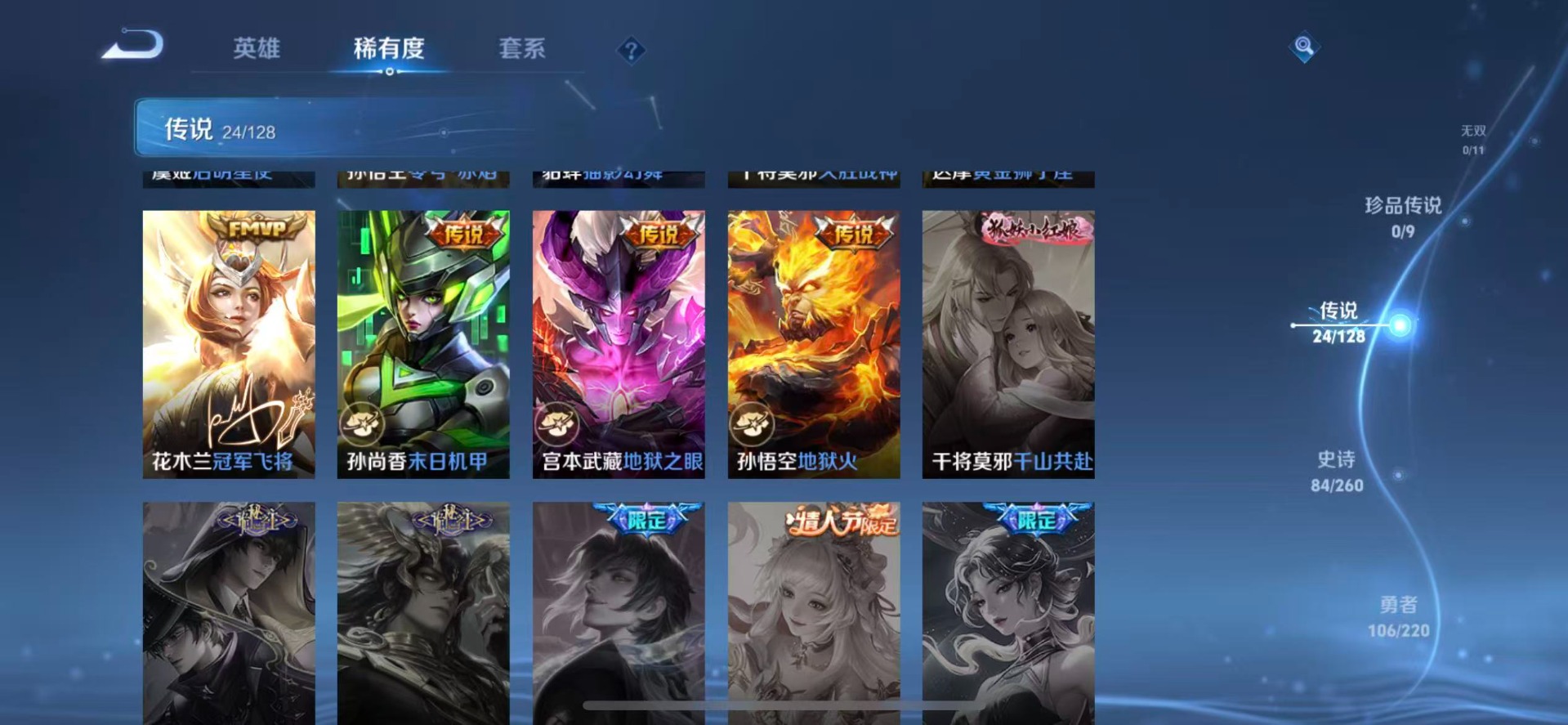 - [11867229]V8 1典藏 2珍品传说 16传说 123英雄 243皮肤 可修改实名 优质装备:天鹅之梦(小乔典藏),器灵·落星盏,大耳狗之梦,猫影幻舞,云霓雀翎,仲夏夜之梦(大飞蛾),音你心动-小乔,游龙清影(小青龙),音你闪耀(rap皮),霜月吟,涂山容容 传说皮:幻光神枪 珍宝阁皮:胡桃夹子,蔷薇恋人 限定皮:愿照·众生和(妲己年限),映山客,鸣野蒿,太华(伽罗年限),武陵仙君(小桃花),异界灵契(白毛香),前尘镜,时之彼端,玄嵩(庄周年限),瑞麟志(木兰年限),遇见飞天,高山流水,五谷丰年,游园惊梦,梁祝,天狼狩猎者,李小龙,如梦令-嫦娥,奇迹圣诞,纯白花嫁,猪悟能,一生所爱,时之奇旅-妲己 史诗皮:化蝶舞,石田雨龙,百相守梦-黄忠,织梦人,遇见神鹿,特工魅影,江河有灵,魅语,无限星赏官,冰冠公主,青蛇,偶像歌手,末日机甲-吕布,时之恋人-孙尚香,节奏热浪,女仆咖啡,摇滚巨星,水果甜心,天才门将,心灵骇客,时之奇旅-安琪拉,暗隐猎兽者,幽灵船长,鬼剑武藏,心灵战警,舞动绿茵,繁星吟游(呼啦呼啦),拒霜思,缤纷独角兽,乘风破浪,逐浪之夏,箭羽风息,唤灵魅影,圣诞狂欢,圣诞恋歌,鹰眼统帅,暗夜贵公子,魅力维加斯,奇遇舞章,未来纪元-赵云
