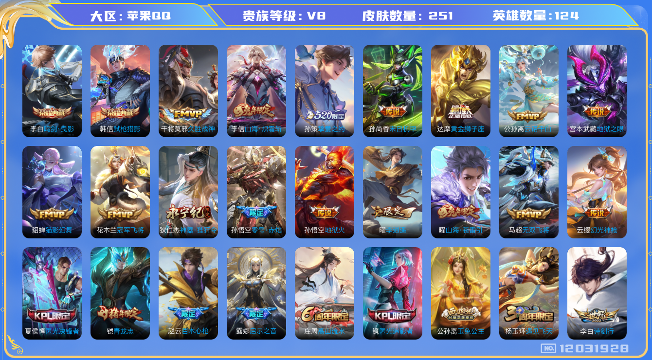 [12031928]V8 2典藏 24传说 124英雄 251皮肤 可修改实名 优质装备:鸣剑·曳影,弑枪猎影(韩信典藏),黄金狮子座,冠军飞将,猫影幻舞,久胜战神,末日机甲-孙尚香(绿蚂蚱),地狱火,零号·赤焰,地狱之眼,李逍遥,挚爱之约,无双飞将,神器·狴犴令,山海·炽霜斩(李信年限),山海·苍雷引(电光曜子),涂山容容 传说皮:云诺千山,幻光神枪 珍宝阁皮:妄想食味,蔷薇恋人 限定皮:愿照·九州拓(澜年限),鸣野蒿,傲雪梅枪,前尘镜,遇见飞天,高山流水,诗剑行,齐天大圣,匿光决锋者,降魔,五谷丰年,青龙志(铠年限),孙行者,匿光追影者,时之祈愿-云中君,百木心枪,玉兔公主,启示之音,深海之息(深海大菠萝),山海·玄木吟(马可年限) 史诗皮:器灵·浮梦炉,星界战将,龙之律动,石田雨龙,蒙犽顽岩魄,星界特工,百相守梦-黄忠,遇见神鹿,紫霞仙子,电玩小子(小书包),特工魅影,千年之狐,永昼,江河有灵,魅语,蒙恬荣光圣徽,无限星赏官,偶像歌手,晚萤,电玩·爆裂旋风,末日机甲-吕布,猫狗日记-孙策,乱世虎臣,节奏热浪,修罗,摇滚巨星,水果甜心,绅士熊喵,星夜王子,心灵骇客,功夫厨神,德古拉伯爵,鬼剑武藏,心灵战警,乐园奇幻夜,地狱岩魂,缤纷独角兽,乘风破浪,逐浪之夏,龙鼓争鸣,水晶猎龙者,曙光守护者,金属风暴,原初追逐者,鹰眼统帅,暗夜贵公子,魅力维加斯,黎明之约,赏金猎手,天秀·音浪,滕王阁序,无心,未来纪元-赵云