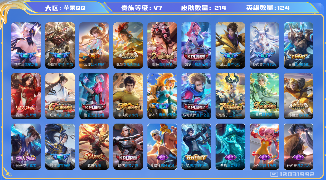 [12031992]V7 6传说 124英雄 214皮肤 可修改实名 优质装备:零号·赤焰,燃星之曲 传说皮:幻光神枪 珍宝阁皮:妄想食味,优雅恋人,蔷薇恋人 限定皮:鸣野蒿,至尊宝,异界灵契(白毛香),傲雪梅枪,飞衡(韩信年限),高山流水,怒海麟威,五谷丰年,游园惊梦,逐梦之星,天狼溯光者,李小龙,逐梦之影,孙行者,一生所爱,青春决赛季,匿光追影者,女儿国国王,百木心枪 史诗皮:电玩小子(小书包),白龙吟,特工魅影,千年之狐,永昼,百解令(蒙犽),蒙恬荣光圣徽,冰冠公主,末日机甲-吕布,猫狗日记-孙策,时之恋人-孙尚香,女仆咖啡,水果甜心,绅士熊喵,天才门将,星夜王子,时之奇旅-安琪拉,功夫厨神,暗隐猎兽者,幽灵船长,鬼剑武藏,心灵战警,纤云弄巧,繁星吟游(呼啦呼啦),拒霜思,缤纷独角兽,乘风破浪,逐浪之夏,水晶猎龙者,曙光守护者,金属风暴,圣诞狂欢,圣诞恋歌,鹰眼统帅,魅力维加斯,赏金猎手,未来纪元-赵云