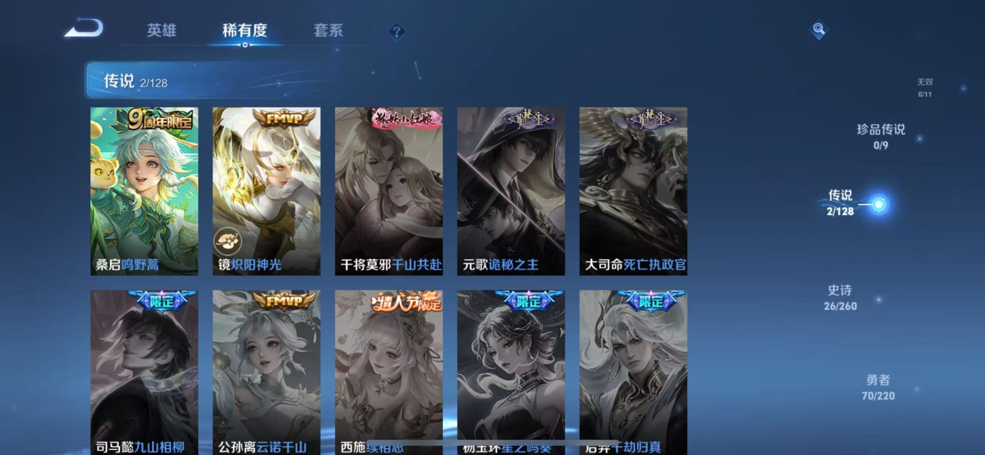 - PX_2083715-实名: 可修改 贵族等级: V7 英雄数: 122 皮肤数: 208 星传说: 未来机甲 传说皮: 云鹰飞将,末日机甲-孙尚香,地狱火,零号·赤焰,超时空战士-狄仁杰,无双飞将 限定皮: 李小龙,游园惊梦,天魔缭乱,神威,天狼狩猎者,孙行者,傲雪梅枪,深海之息,五谷丰年,鸣野蒿