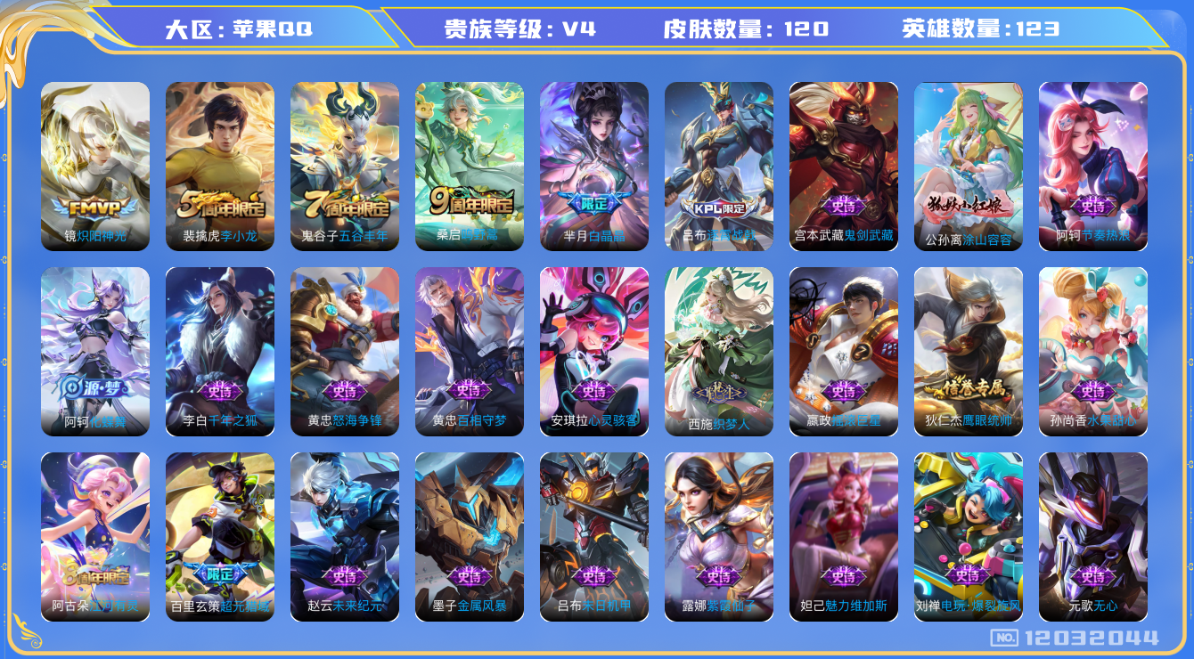 [12032044]V4 2传说 123英雄 120皮肤 可修改实名 优质装备:炽阳神光,涂山容容 珍宝阁皮:妄想食味 限定皮:逐霄战戟,鸣野蒿,白晶晶,五谷丰年,李小龙 史诗皮:化蝶舞,怒海争锋,超元猎域,百相守梦-黄忠,织梦人,紫霞仙子,千年之狐,江河有灵,电玩·爆裂旋风,末日机甲-吕布,节奏热浪,摇滚巨星,水果甜心,心灵骇客,鬼剑武藏,金属风暴,鹰眼统帅,魅力维加斯,无心,未来纪元-赵云
